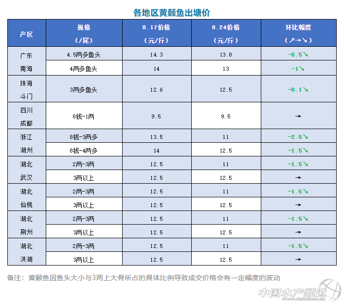 | 中國水產頻道原創報道, 文/圖 何氏水產、水產前沿 李靜 黃顙魚 1、本周廣東黃顙魚價格保持穩定,4.5兩魚頭報價13.8元/斤,比上周下跌了0.5元/斤;4兩多魚頭報價13元/斤,比上周下跌了1元/斤;3兩多魚頭12.5元/斤,比上周下跌了0.1元/斤。近段時間雜交魚難開,且成數太亂。大部分流通商都以開單性魚為主了。銷量跟上周也差不多,預計價格或將還會有小幅小滑。 2、浙江湖州黃顙魚價格保持穩定,3兩多魚頭11元/斤,比上周下跌了2.5元/斤;4兩多魚頭報價12.5元/斤,比上周下跌1.5元/斤。湖北各地黃顙魚價格,2-3兩多魚頭價格在11元/斤左右,比上周下跌了1元/斤。3兩以上價格穩定,還是12.5元/斤,銷量跟上周也差不多。預測接下來價格還會有小幅下滑。 |
