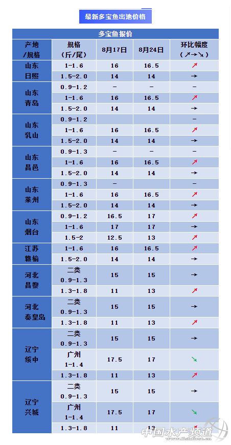| 中國水產頻道原創報道, 一周多寶魚價格播報及行情解析 文 |工業化水產圈 實習編輯 葉繼良 多寶魚一周行情簡析 8月20日下午,深圳市政府新聞辦召開新聞發布會介紹深圳市疫情防控最新情況,截至當日8時,共計采集人員樣本61.77萬余份(包括全市盒馬鮮生21家超市門店、2家倉庫全體員工),已完成檢測59.02萬份。除8月14日發現的2例無癥狀感染者和19日在已隔離的密接者中新發現的1例無癥狀感染者外,目前其它檢測結果均為陰性。 8月22日,廣東省政府舉辦疫情防控新聞發布會,介紹農貿市場疫情防控工作。7月13日以來,全省累計開展進口冷凍肉和水產品核酸檢測34.93萬例(其中人員檢測17.14萬人,產品檢測7.88萬例,環境檢測9.91萬例),連續五周100%完成每周全覆蓋檢測任務,從8月14日到現在沒有發現新增陽性樣本,目前廣州、佛山的盒馬門店已全部恢復正常營業。 武漢市衛生健康委通報顯示,截至8月22日,共采集20家盒馬鮮生門店的5862份環境樣本、5072件動物性食品樣本、737位從業人員,新冠病毒核酸檢測結果均為陰性。 隨著各地檢測結果均為陰性,本周多寶魚價格也略有上漲,山東地區中標規格上漲了0.5元/斤,超標價格穩定在14元/斤,河北遼寧地區二類標魚價格穩定在15元/斤,大標價格上漲2元達到13元/斤,總體來說多寶魚價格仍舊處于低谷區。山東地區價格目前較平穩,而遼寧地區的魚價變動的比較頻繁,可能是由于地域影響,東北多寶魚市場比較敏感。 “今年養殖戶損失太大了,目前的價格還是不好,最好能在漲點價格,大標達到15-16元/斤以上,大家才能好點!币晃欢鄬汈~從業者表示。據了解,目前市場上由于較低價格,養殖戶普遍存魚,導致大魚過多,而2.5斤以上就很難賣掉。大標魚的主要消耗市場在黑龍江、吉林、大連、沈陽和天津,而今年東北三省疫情嚴重,導致許多酒店飯店關門歇業狀態,消費端消耗量太低。即使養殖戶存魚,但后期的價格走勢難以預測,仍然存在很大的風險。 |