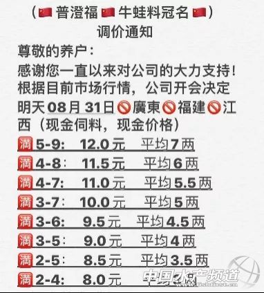 | 中國水產頻道原創報道, 牛蛙觸底反彈, 這波漲價潮還能持續多久? 文/ 水產前沿 陳曉慶 牛蛙行情 本周牛蛙價格繼續下滑。目前牛蛙主流廠家報價:4-8兩10.5元/斤,4-7兩/10.0元/斤,3-7兩/9.0元/斤,3-6兩/8.5元/斤,3-5兩/8.0元/斤,2-5兩/7.5元/斤,2-4兩/7.0元/斤。 牛蛙塘頭價格相比上周又下降了2.5-3元/斤。從本月中旬開始,海南、福建、廣西、珠三角等地新蛙上市不斷補充市場,不到半個月時間牛蛙現金價格從最高的19元/斤跌到了10元/斤。近段時間高溫天氣持續,蛙的發病率增高,再加上前段時間行情較好,為了趕價格拼命投料,這也導致了蛙發病率的提高,養殖戶為了及時止損而選擇出蛙。 最近牛蛙一直在掉價,價格混亂,市場也不敢存貨。“市場殺價就會把你搞死,每個地方價格都不一樣,一車就得虧一兩萬”,批發商羅老板告訴筆者。 但好消息是,牛蛙價格從明天開始回升。 半個月的跌價,跌破了10元/斤,也逐漸突破了養殖戶的心理預期,養殖戶惜售,收蛙開始變得困難。下午,牛蛙主流廠家恒源發布漲價通知,多地現金價格也將上漲。牛蛙價格開始反彈,這一波漲價潮還能持續多久? 黑斑蛙行情 |