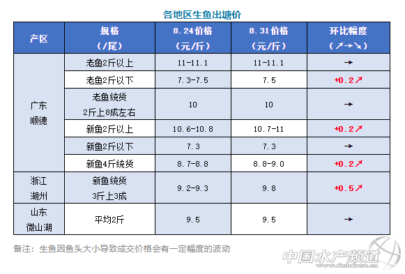 | 中國水產頻道原創報道, 文/圖 何氏水產、水產前沿 李靜 生魚 1、本周廣東生魚塘頭價格比上周略有上漲,塘頭報價老魚2斤以上11-11.1元/斤,跟上周一樣;2斤以下報價7.5元/斤,比上周上漲了0.2元/斤;老魚統貨2斤上8成左右報價10元/斤,保持穩定;新魚4斤統貨8.8-9.0元/斤,比上周上漲了0.2元/斤;2斤上報價10.7-11元/斤,比上周也上漲了0.2元/斤;2斤以下報價7.3元/斤,跟上周一樣。每塘魚的最終成交價格都是根據魚頭大小以及2斤以上成數來決定的。高溫天氣持續,塘頭抓魚硬骨、白身的情況時有發生。市場需求有所增加,養殖戶惜售待價心理增強,價格較上周稍有上升。預測后市可能還會有小幅上漲機會。 2、浙江湖州本周新魚統貨3斤上3成左右報價9.5,比上周上漲了0.5元/斤。山東微山湖產區本周價格保持穩定,平均2斤報價9.5元/斤,銷量跟上周也差不多。 |