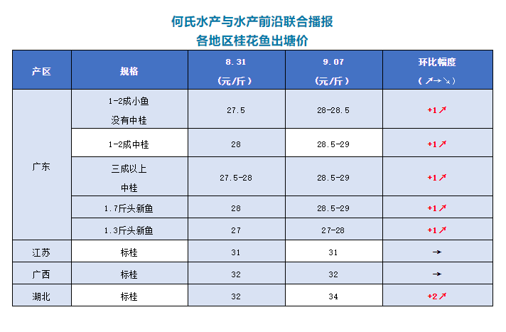 | 中國水產頻道原創報道, 文/圖 何氏水產、水產前沿 李靜 桂花魚 廣東鱖魚行情有所好轉,價格也開始有所回升。1-2成小魚沒有中桂開塘28-28.5元/斤,比上周上漲了1元/斤;1-2成中桂開塘價28.5-29元/斤,比上周上漲了1元/斤;三成以上中桂價格也是28.5-29元/斤,比上周上漲了1元/斤。新魚1.7斤魚頭比上周上漲1元/斤,塘頭報價28.5-29元/斤;1.3斤魚頭價格比上周也上漲了1元/斤,報價27-28元/斤。現在老魚和新魚的價格基本一樣,對于老魚養殖戶來說還是虧損的,新魚的養戶更是看好后市行情,惜售待價。預計接下來價格或將還會有小幅上升。 廣西產區標桂價格基本穩定,價格還是32元/斤,當地很少魚出了;湖北產區標桂價格本周比上周上漲了2元/斤,報價34元/斤,當地老魚基本結束,新魚還未上市;江蘇州地區標桂本周保持穩定,價格還是31元/斤。 |