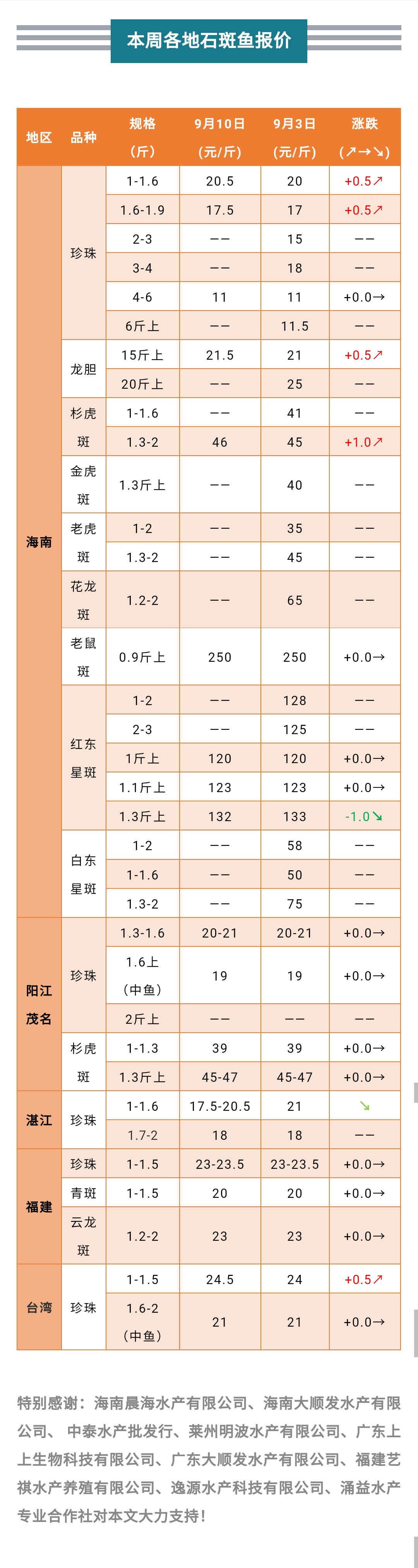 | 中國水產頻道原創報道, 自8月下旬石斑魚行情快速回暖后,各地小珍珠價格波動不大,養戶都盼中秋、國慶再漲一輪 文/ 水產前沿 實習編輯 吳寧靜 行情簡析 海南地區:本周海南小珍珠再次小漲0.5元/斤。15斤上龍膽上周跌3元/斤后,這周回暖0.5元/斤。從業者表示:今年大珍珠存塘量較多,龍膽上漲有難度,規格小珍珠后市依舊有上漲空間。筆者建議:進入9月,“白露劫”到來,這個時期的石斑魚容易暴發小瓜蟲、指環蟲等寄生蟲病和腸炎等,養殖朋友要特別警惕,做好防控措施。 廣東地區:本周廣東石斑魚價格變動不大。雙節即將到來,很多養殖戶都在期盼能在節日前后大漲一波,畢竟現在的存塘還是不少的。本周湛江珍珠的走魚量不錯,小珍珠報價17.5-20.5元/斤,比較挑剔的流通商報價18-21元/斤。 福建地區:本周福建石斑魚價格保持穩定。不過福建從業者表示:預計明后天,小珍珠會小漲一波。海南石斑魚漲價一般會帶動其他地區漲價,筆者也將持續跟進。 臺灣地區:本周臺灣小珍珠小漲0.5元。流通商表示現在臺灣小珍珠的貨源不多,存塘量較少,養殖戶普遍都比較惜售。 即將到來的中秋、國慶、元旦都是婚宴旺季,春節更是海鮮消費高峰期,隨著國內疫情好轉,各種宴席、年會都會陸續增多起來,石斑魚的需求可能會因此增加,魚價會不會出現大反彈回暖?歡迎評論區留言發表觀點。 |