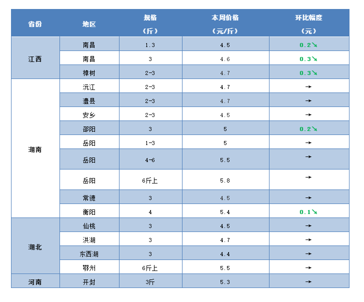| 中國水產(chǎn)頻道原創(chuàng)報道, 青島新冠感染突增,多地淡水魚行情直線下跌!養(yǎng)殖戶心里拔涼拔涼! 文/ 水產(chǎn)前沿 鄭鵬飛 一周要聞 1.華中出現(xiàn)恐慌性拋售,淡水魚大幅下跌! 近期青島地區(qū)出現(xiàn)多例新冠感染病例。出于對疫情擔心導致農(nóng)貿(mào)市場、水產(chǎn)交易市場會不會如之前封鎖,結(jié)果是大量的魚滯留魚塘,近日有養(yǎng)殖戶出現(xiàn)恐慌性拋售,華中部分地區(qū)淡水魚行情直線下跌,養(yǎng)殖戶心里一陣拔涼。據(jù)了解,10月10日,武漢白沙洲市場半斤的鯽魚只賣到4.5元/斤;昨天和前天草魚都出現(xiàn)倒行,3斤的草魚賣4.7元/斤;10斤的大頭魚低的時候只賣到3.5元/斤,甚至出現(xiàn)20斤重的大頭魚2.4元/斤還要求著賣;1-1.3斤的鳊魚賣4.9元/斤;1斤以上的白鰱賣3塊左右,1斤以下的最低賣到1.2元/斤,鱖魚、鱸魚、黃顙魚、鯽魚也是狂跌。最近江西大水面草魚也開始大批拋售,目前南昌地區(qū)3斤的草魚最新塘頭價賣4.6元/斤,較之前下滑0.3元/斤。 2.西南、西北多地降溫降雪,草魚行情也繼續(xù)有明顯下滑 了解到,目前四川廣元地區(qū)3斤的草魚最新塘頭價賣6元/斤,再次下滑0.3元/斤,成都地區(qū)草魚價格行情也是繼續(xù)有所下滑。據(jù)流通商介紹,目前甘肅蘭州市場3斤左右的草魚最新報價在6.3元/斤左右,再次下滑0.2元/斤。 3.好消息是,最近華南大草魚出現(xiàn)回暖勢頭! 今年的冷空氣讓脆肉鯇銷售火爆。據(jù)了解,目前廣東中山新魚每日銷量達到15萬斤。近期大草魚的行情更是有被小幅拉升的趨勢,目前6斤以上的大草魚塘頭賣到6.3元/斤,上漲0.1元/斤。目前廣西桂林地區(qū)3斤的草魚最新塘頭價賣5.5元/斤,較上周也上漲了0.2元/斤,養(yǎng)殖戶表示看好后期行情。 一周行情 華南地區(qū) 節(jié)后,華南地區(qū)的草魚整體行情不是很樂觀,其中草魚苗種、統(tǒng)鯇都有一定程度下滑,大草魚和脆肉鯇基本保持穩(wěn)定。今年的冷空氣讓脆肉鯇銷售火爆,目前廣東中山新魚銷量達到15萬斤每日,近期大草魚的行情有被小幅拉升的趨勢。 中山:據(jù)了解,最近廣東地區(qū)草魚苗種行情持續(xù)走跌,惠州地區(qū)滯銷比較嚴重,目前中山黃圃1-3兩的草魚塘頭賣5元/斤,較上周下滑0.3元/斤。近期,脆肉鯇銷售比較好,大草魚行情出現(xiàn)回暖趨勢。目前,6斤以上的大草魚塘頭苗6.3元/斤,上漲0.1元/斤。 珠海:最近,珠海地區(qū)的統(tǒng)鯇塘頭價較上周下滑了0.2元/斤左右,目前2-3斤的草魚塘頭賣5.2元/斤。 廣西:本周廣西地區(qū)的草魚行情出現(xiàn)小幅反彈。據(jù)了解,目前桂林地區(qū)3斤的草魚最新塘頭價賣5.5元/斤,較上周上漲了0.2元/斤。養(yǎng)殖戶表示,看好后期行情,等天冷之后草魚價格應該還會有所回暖。 華中地區(qū) 本周華中地區(qū)的淡水魚行情出現(xiàn)大幅下滑的勢頭,尤其近期青島地區(qū)出現(xiàn)多例新冠感染病例,之前的疫情的影響更是給大家留下了巨大陰影。近期出現(xiàn)恐慌性拋售,不少養(yǎng)殖戶紛紛開始賣魚,擔心會再次出現(xiàn)魚出不去的情況。 江西:據(jù)了解,最近江西不少大水面開始大量賣魚,嚴重沖擊周邊市場,江西本地的魚價也是出現(xiàn)了0.2-0.3元/斤的下滑。從養(yǎng)殖戶了解到,目前南昌地區(qū)3斤的草魚最新塘頭價賣4.6元/斤,較之前下滑0.3元/斤。 湖南:本周湖南地區(qū)的草魚行情雖然也是有下滑勢頭,但是大部分地區(qū)塘頭價暫時沒有出現(xiàn)太大波動。據(jù)了解,目前長沙市場3斤的草魚批發(fā)價在5元/斤左右,塘頭價賣到4.8元/斤,養(yǎng)殖戶表示目前行情不是很好,估計天冷之后也很難好轉(zhuǎn)。目前,永州地區(qū)3斤的草魚塘頭賣5.3元/斤,銷量不大,行情不樂觀。有養(yǎng)殖戶反映,最近常德部分地區(qū)草魚行情還是繼續(xù)有小幅下滑。 湖北:在青島新冠事件發(fā)生之后,不少養(yǎng)殖戶出現(xiàn)恐慌性拋售,近期湖北淡水行情出現(xiàn)全線下跌的情況,養(yǎng)殖戶心里真是一陣拔涼。據(jù)了解,最近武漢白沙洲市場淡水魚行情直線下跌。10月10日,白沙洲市場半斤的鯽魚只賣到4.5元/斤,連飼料成本都不夠。昨天和前天白沙洲市場草魚都出現(xiàn)倒行,3斤的草魚賣4.7元/斤,和標草差不多,最近每天都有5-6萬斤草魚4.4元/斤殺頭賣;10斤的大頭都只賣到5.3元/斤,低的時候只賣到3.5元/斤,甚至出現(xiàn)20斤重的大頭魚2.4元/斤還要求著賣;1-1.3斤的鳊魚才賣到4.9元/斤,低的時候賣4.5元/斤;1斤以上的白鰱賣3塊左右,1斤以下的最低賣到1.2元/斤,目前鱖魚、鱸魚、黃顙魚以及鯽魚也都是狂跌。 有養(yǎng)殖戶表示,現(xiàn)在大家都是非?只牛绕淝鄭u事件之后大家都害怕再次封路,都在積極出魚,近期江西的草魚已經(jīng)開始大批甩賣。了解到,最近隨州地區(qū)草魚行情有小幅反彈,目前3斤的草魚最新塘頭價賣4.8元/斤,相比上周有0.8元/斤的反彈,但是養(yǎng)殖戶表示今年冬天魚價估計很難有好轉(zhuǎn)。 華東地區(qū) 本周華東地區(qū)的草魚塘頭價整體上還是沒有出現(xiàn)太大波動,基本維持上周水平。 江蘇:據(jù)了解,目前江蘇地區(qū)3斤以上的草魚塘頭價基本維持在5.4-5.5元/斤。有養(yǎng)殖戶表示,目前淮安涇口地區(qū)3斤的草魚最新塘頭價賣5.5元/斤,目前行情相對穩(wěn)定。 福建:本周福建地區(qū)的草魚行情也是比較穩(wěn)定。據(jù)養(yǎng)殖戶介紹,目