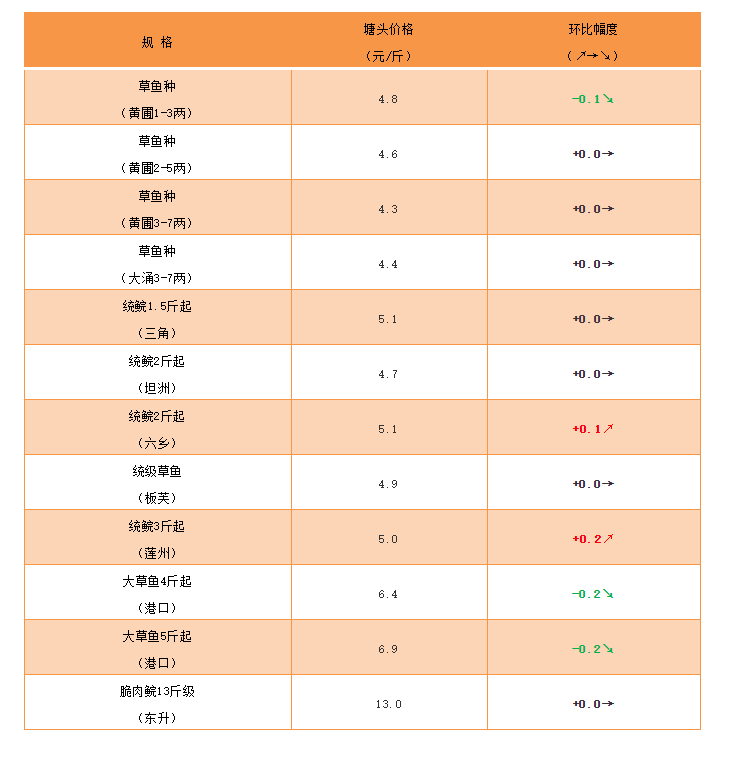 | 中國水產頻道原創報道, 文/水產前沿何鴻浩 草魚:大草魚略有下跌,統鯇回暖 草魚種:本周小規格草魚種微跌,基本價格趨向穩定,現階段市場供求關系平衡,預計后市價格都會偏向穩定。此外,近期天氣轉涼,晝夜溫差大,魚塘需提前做好改底消毒工作,避免因寒潮出現泛底、爛身等情況。 統鯇:本周價格整體穩定,1.5斤價格維持不變,5.1元/斤;2斤上有些區域價格上漲0.1元/斤,4.7-5.1元/斤;3斤上較上周上漲0.2元/斤,5.0元/斤。 大草魚:價格較上周出現下跌,跌幅約0.2元/斤,4斤上6.4元/斤;5斤上6.9元/斤。 脆肉鯇:本周脆肉鯇價格繼續穩定于高位,今年天氣提前轉冷,市場需求依舊較大大,目前足規格新魚已迎來出魚高峰,市場供求平衡,因此較短期內會穩定。 |