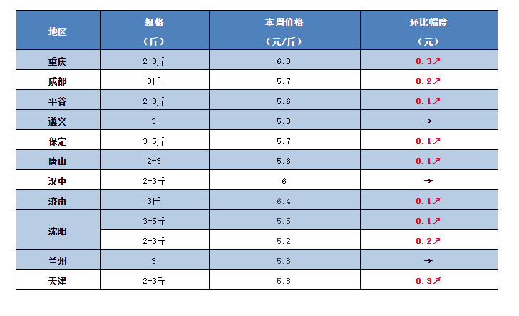 | 中國水產頻道獨家報道, 草魚全線漲價!湖北、江西大草魚突破6元/斤、福建3斤草魚賣到5.7元/斤、四川最高上漲0.5元/斤,廣東草魚苗再次突破5元大關 文/水產前沿鄭鵬飛 一周要聞 多地下架、禁售進口凍品,違者嚴懲!豬價還會漲? 作為全國最大的凍品物流中轉基地—鄭州物流港冷庫,自12月12日7點起,鄭州全區冷庫關閉冷庫,所有貨物暫時禁止出入庫,開市時間另行通知! 由于近期冷凍食品核酸陽性事件頻發,除了鄭州物流港冷庫外,多地要求關閉冷庫,停售進口冷凍食品,目前還有陜西西安、湖北襄陽、安徽合肥、北京、天津多地冷庫關閉,所有貨物暫時禁止出入庫或就地封存,銷售場所、冷庫全面徹底消殺......據農牧前沿消息,今天豬肉幾近全線上漲。 全國草魚價格全線反彈上漲 冷空氣南下,消費量上升,捕魚難度加大,全國草魚行情全線飄紅。目前華南、華東、西南地區草魚行情有回暖勢頭,華中、華北以及東北地區呈現持續上漲勢頭。 據了解,目前北方的魚塘幾乎全面封凍,魚車普遍南下抓魚。目前武漢白沙洲市場每天的四大家魚交易量已超過300萬斤。尤其最近幾天長江沿線城市也開始大范圍降雪,未來行情還是有望持續走高。 目前,廣東中山1-3兩的草魚苗再次突破5元/斤,3斤的草魚塘頭價賣到5.4元/斤。湖南常德3斤的草魚最新塘頭價賣到5.1元/斤,上漲0.2元/斤,長沙草魚苗開始很緊張了。湖北洪湖3斤的草魚最新塘頭價賣5.1-5.2元/斤;隨州7斤的草魚塘頭價已賣到6元/斤以上。江西新余地區3-4斤的草魚最新塘頭價賣5.1元/斤,6斤的大草魚塘頭價也已突破6元大關;福建南平3斤的草魚賣到5.5元/斤,上漲0.2元/斤,閩江地區已經賣到5.7元/斤。目前,江蘇淮安地區3-5斤的草魚塘頭價在5.2-5.3元/斤。河北唐山3斤的草魚最新塘頭價已經賣到5.6元/斤,天津寶坻最高賣到5.8元/斤,上漲0.3元/斤。四川德陽地區3斤的草魚塘頭賣到6元/斤,上漲了0.5元/斤;成都三岔湖最新報價也已經賣到5.7元/斤,上漲0.2元/斤。 四川德陽3斤草魚突破6元/斤,暴漲0.5元/斤 天津地區3斤草魚再漲0.3元/斤,塘頭價賣到5.8元/斤 湖南長沙草魚苗吃緊,養殖戶表示明年草魚行情會更好 一周行情 華南地區 本周華南地區的草魚整體行情也是穩中有升,其中珠三角地區草魚種有0.1-0.2元/斤的上漲,成魚價格整體上保持穩定。 中山:隨著氣溫的降低,加上苗種價格相對低迷,近期養殖戶賣苗積極性不高,近期草魚苗種整體行情有所回暖。據了解,目前中山黃圃1-3兩的草魚苗再次突破5元/斤,其他規格也都有0.1-0.2元/斤的上漲。從流通商了解到,目前中山地區3斤的草魚最新塘頭價賣到5.4元/斤,相比之前也是開始有小幅上漲。 廣西:本周廣西地區雖然降溫非常明顯,局部甚至下去了雪,但是魚價行情暫時還是沒有太大變化。據了解,目前武宣地區3斤的草魚塘頭賣5.5元/斤,桂林地區最新塘頭價也還是繼續維持在5.3元/斤左右。 華中地區 本周華東地區的草魚行情整體上呈現上升趨勢,多地塘頭價再次出現上漲。尤其近期長江沿線城市很多有已經開始下雪,接下來出魚的難度會進一步加大,未來行情還是有望持續走高。 湖南:本周湖南的草魚行情也是再次出現小幅上漲。從養殖戶了解到,目前常德地區3斤的草魚最新塘頭價賣到5.1元/斤,較之前上漲0.2元/斤。最近幾天長沙地區的草魚行情不是很好,成魚價格暫時沒有什么好轉。不過養殖戶表示,現在當地的草魚苗開始很緊張了,預計明年的草魚行情會比今年要好。 湖北:本周湖北的草魚塘頭價整體上呈現回暖勢頭。冷空氣南下,北方魚塘封凍使得魚車開始后南下,目前武漢白沙洲市場每天的四大家魚交易量已經超過了300萬斤,而且有部分水車不進市場直接到塘口裝魚,而且水車數量還在不斷增加。目前洪湖地區草魚塘頭價相比上周繼續有小幅上漲,3斤的草魚最新塘頭價賣5.1-5.2元/斤,目前出魚量不大。據了解,最近隨州地區養殖戶大多開始賣大草魚,目前7-9斤的草魚最新塘頭價基本都在6元/斤以上。近期賣魚的增多導致市場上的魚價行情受到影響,了解到最近兩天武漢的草魚行情出現回落,下滑幅度在0.2-0.3元/斤。由于大行情普遍在回暖,這次的下滑應該是暫時的。 江西:本周江西地區的草魚行情也是繼續有上漲勢頭。從養殖戶了解到,目前江西新余地區3-4斤的草魚最新塘頭價賣5.1元/斤,5斤的賣5.4元/斤,6斤的大草魚塘頭價基本在6元/斤以上;南昌地區3斤的草魚最新塘頭價也基本在4.8-5元/斤之間。 華東地區 本周華東地區的草魚行情也是終于開始有點好轉了,尤其福建地區的草魚塘頭價漲勢明顯。 福建:據養殖戶介紹,最近幾天閩江地區草魚行情繼續保持上漲勢頭,目前3斤的草魚最新塘頭價在5.7元/斤,繼續有0.1元/斤的小幅上漲;南平地區3斤的草魚最新塘頭價賣到5.5元/斤,相比上周上漲了0.2元/斤。 江蘇:據了解,最近江蘇草魚行情整體上還是不是太理想。養殖戶表示,雖然塘頭價格起來了但是市場上走不動。目前,淮安地區3-5斤的草魚塘頭價在5.2-5.3元/斤,到市場也就賣5.4-5.5元/斤,小草魚的行情依然很低迷。目前徐州部分地區3斤的鯉魚塘頭價還是只有4元/斤,草魚最低賣到4.5元/斤。 浙江:最近浙江地區的草魚行情還是沒有太大變化。據養殖戶介紹,目前衢州地區3斤的草魚最新塘頭價繼續保持在5元/斤左右,基本維持上周水平。 其他地區 華北地區:隨著冷空氣的不斷南下,目前華北地區的魚塘基本都