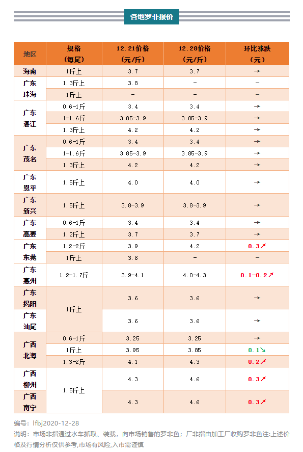 | 中國水產(chǎn)頻道獨家報道, 明后日起,廣東氣溫將呈斷崖式下跌,不過冬的養(yǎng)殖戶希望盡快出魚,但市場目前走量不大,部分加工廠可能下調(diào)收購價格 文/水產(chǎn)前沿葉豐齊 水產(chǎn)前沿專業(yè)為你推送羅非魚 最新價格行情及行業(yè)新聞、各類資訊。 同時歡迎行業(yè)人士踴躍爆料,請掃二維碼聯(lián)系 代表產(chǎn)區(qū)羅非魚行情走勢 一周要聞 明后日起,廣東氣溫將呈斷崖式下跌,不過冬的養(yǎng)殖戶希望盡快出魚,但市場目前走量不大,部分加工廠可能下調(diào)收購價格。 整體行情綜述 海南有新魚上市,羅非價格起不來。珠三角地區(qū),珠海羅非基本賣完,價格無變化;東莞魚頻裝外地車,市場價較上周上調(diào)0.3元/斤;恩平羅非所剩無幾,市場與廠價皆保持不變;新興市場難走量,羅非價格保持;肇慶高要近期出魚量不多,羅非價格基本無變化。粵東惠州規(guī)格魚減少,市場非最高上調(diào)0.2元/斤;揭陽、汕尾積極出魚,市場難走,主要進(jìn)凍廠,價格保持平穩(wěn)。粵西地區(qū)廠非價格持平,但據(jù)悉明日開始下調(diào)。廣西北海廠非正常收購,價格暫無變動,市場價因大規(guī)格魚存塘和吃料減少而上調(diào)。 各產(chǎn)地行情分析 海南地區(qū):加工廠正常收購,不過近期有新魚上市,羅非價格起不來。1斤上規(guī)格廠非3.7元/斤,塘頭現(xiàn)金收購價3.5元/斤,皆同上周價格。 珠三角地區(qū):外地車助力出魚,市場行情基本維持穩(wěn)定,個別存塘規(guī)格魚減少,甚至能稍漲一點。珠海1.3斤上規(guī)格羅非基本出完,報價無變化。東莞1.2-2斤以上規(guī)格外地車抓塘頭價4.2元/斤,環(huán)比上周上調(diào)0.3元/斤。恩平1斤上廠非3.7元/斤,1.8-2斤規(guī)格市場非4元/斤,皆保持上周價格。新興市場非1.3斤抓起到手價3.8-3.9元/斤,同上周。肇慶高要0.6-1斤規(guī)格廠非塘頭價3.4元/斤,飼料廠合同魚3.3元/斤,市場非1.2斤上實捉1.4斤起3.7元/斤,皆與上周行情持平。 粵東地區(qū):局部區(qū)域規(guī)格魚減少,養(yǎng)戶準(zhǔn)備過冬,市場開始稍稍上調(diào)價格。惠州1.2-2斤規(guī)格羅非走本地市場,上午車4元/斤,環(huán)比上周上調(diào)0.1元/斤;下午車4.3元/斤,環(huán)比上周上調(diào)0.2元/斤。揭陽和汕尾1-1.2斤上規(guī)格市場非4元/斤,1斤以上規(guī)格廠非(走汕尾本地凍廠)塘頭價3.6元/斤,維持上周行情。 粵西地區(qū):廠非價格持平,但因近日收購量較大,明天或下調(diào)。市場非則由于較難走量,出魚不多,價格維持。湛江與茂名0.6-1斤規(guī)格廠非3.1元/斤,加成后3.3-3.4元/斤,1-1.6斤規(guī)格3.85-3.9元/斤;而市場非1.5斤抓起4.2元/斤,皆保持上周價格。 廣西地區(qū):廠非價格基本保持;北海0.6-1斤規(guī)格廠非到廠價2.8-3元/斤,5成魚加成3.25-3.3元/斤;1斤上規(guī)格廠非到廠價3.85元/斤,環(huán)比上周下調(diào)0.1元/斤。市場非價格有所上調(diào);北海1.3-2.3斤規(guī)格市場非4.3元/斤,環(huán)比上周上調(diào)0.2元/斤。南寧1.5斤上規(guī)格市場非4.6元/斤,柳州同規(guī)格4.6元/斤,環(huán)比上周皆上調(diào)0.3元/斤。 |