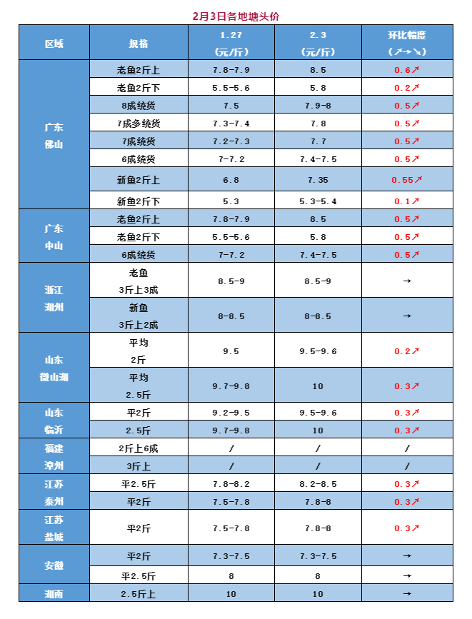 | 中國水產頻道原創(chuàng)報道, 多地新魚、舊魚齊漲,臨近春節(jié)銷量增加,生魚開始絕地反擊! 文/水產前沿林貞武 老魚裝車價漲至8.8元/斤,或能達10元/斤,新魚漲至7.8元/斤 魚價猛漲,5天內漲了5毛錢,今天舊魚2斤上裝車價漲至8.7-8.8元/斤!舊魚2斤上9成統(tǒng)貨達到8.3元/斤,訂有魚的流通商近期給的定金也比較高,害怕養(yǎng)殖戶塌定,手里有魚的魚中表示必須要現金才能給發(fā)貨。目前很多養(yǎng)殖戶心理價位被這波漲價迅速提升,甚至有人揚言裝車價馬上突破9元/斤,可以達到10元/斤,現在暫時不會出手!新魚2斤上塘頭價7.35元/斤,2斤下塘頭價5.3元/斤,1斤下按照2斤下中魚價計算,2斤上大魚發(fā)車價從早上的7.6元/斤漲至7.8元/斤了,統(tǒng)貨5.5成6.7元/斤,養(yǎng)殖戶處于觀望狀態(tài),有人表示春節(jié)后加工廠重新開工,估計新魚還要繼續(xù)漲!馬上就要到春節(jié)了,疫情穩(wěn)定,大多數流通商手里又只有很少的魚,生魚魚價似乎開始要坐火箭式飛漲了! 塌定成風,流通搶魚 廣東這幾天市場暢銷,流通基本上人均日需求量在十幾二十萬斤以上,據悉今早8點時候一流通商早已抓了20萬斤魚上車,現在還在找魚,日流通量為280萬斤/日左右。據流通上反饋,之前價格低的時候訂的魚基本都被塌定了,甚至有個別老板現在手里基本被塌完了,沒有魚,原本就緊張大的魚更加緊缺了!“昨天一天內塌定了很多塘,自己4、5號兩天的魚基本被塌了,還有一塘準備7號出的魚現在談判中,看能不能加點錢可以順利出到!币霍~中表示。目前個流通商都在盯著養(yǎng)殖戶的魚,誰家塌定,馬上搶過來! 正常漲價 本次漲價由南方市場開始發(fā)動,屬正常漲價!湖北市場商販表示,受疫情的影響,各地區(qū)消費量有所不同,部分其余受疫情影響酒店大型餐館封閉,不允許請客,喜事緩辦,喪事簡辦的原則,在外經商工作和務工人員都就地過年,對正常增量有所影響。鄭州等市場批發(fā)商傳來消息,最近黑魚較為搶手,不夠商鋪拿貨,對于珠三角、長三角地區(qū)及沿海地區(qū),由于有大量務工人員沒有返鄉(xiāng)過年,人員密集的地方都要消費,所以各地區(qū)有所不同。而按照每年的傳統(tǒng)習貫,春節(jié)前后正是消費旺季,加上現階段市場大魚存塘量少,養(yǎng)殖戶惜售等因素,所以這波漲價應該是正常漲價! 各產地行情與報價 本周多個品種魚價上漲:本周黃顙魚部分區(qū)域大漲0.6元/斤,廣東草魚6斤上大魚突破8元/斤,羅非魚再漲1.2元/斤,加州鱸魚最高漲1元/斤,江團維穩(wěn),鱖魚最高漲2.5元/斤,近期由于疫情不穩(wěn)定,多地禁止酒席,個別品種價格波動,臨近春節(jié),市場銷量增加,生魚價格開始大漲,看來是要火箭式上漲了,歡迎留言區(qū)評論。 廣東佛山本周上漲0.6元/斤。春節(jié)前夕,市場需求量猛增,本周廣東生魚價格急速上漲,流通商不夠魚抓,養(yǎng)殖戶塌定成潮。目前新魚2斤上裝車價7.6元/斤左右,2斤下發(fā)車價為5.8元/斤,2斤上塘頭價為7.35元/斤,2斤下塘頭價5.3-5.4元/斤,2斤上5.5成統(tǒng)貨6.7元/斤左右,主要看魚頭,魚頭越大訂價越高。舊魚2斤上塘頭價8.5元/斤左右,裝車價8.7-8.8元/斤,2斤下塘頭價5.8元/斤,裝車價為6-6.1元/斤,老魚2斤上9成塘頭價8.3元/斤,2斤上7成多統(tǒng)貨7.8元/斤左右,2斤上8成統(tǒng)貨8元/斤左右,2斤上6成統(tǒng)貨7.4-7.5元/斤。疫情穩(wěn)定,春節(jié)消費量增加,市場關閉的部分消費市場重開,業(yè)界表示近期發(fā)車價將突破9元大關! 廣東中山本周價格大漲0.6元/斤。大致情況與佛山類似,老魚2斤上6成統(tǒng)貨7.5元/斤,2斤上7成多最高7.8元/斤,2斤上塘頭價8.5元/斤,中魚塘頭價6元/斤左右,新魚2斤上5.5成統(tǒng)貨6.7元/斤,有人表示近期部分加工廠停止收魚,魚價都這么漲,到時候年后重新開工,那魚價更不得了,生魚價格預計還要漲。 山東本周大魚價格上漲0.3元/斤。本地大魚很少,等行情的養(yǎng)殖戶比較多,出魚很少。目前當地平2斤價格為9.5-9.6元/斤之間,平均2.5斤價格漲至10元/斤,當地養(yǎng)殖戶表示只要大家合力出魚,各方利益平衡,接下來還會漲! 浙江湖州本周價格維穩(wěn)。湖州當地天氣穩(wěn)定,順利出魚,養(yǎng)殖戶出魚積極性不高,當地的一些切片廠年前備貨逐步完成。目前新口魚3斤上2成價格為8-8.5元/斤,當地老魚3斤上3成好魚8.5-9元/斤。 江蘇本周價格漲0.3元/斤。疫情逐步穩(wěn)定,東北、華北市場逐步恢復,當地市場銷量逐步穩(wěn)定,但目前的價格不能符合養(yǎng)殖戶心理價位,養(yǎng)殖戶賣魚積極性不高,供需暫時維穩(wěn)。目前平二斤塘頭價7.8元/斤,平2.5斤價格為8.2-8.5元/斤! 安徽本周價格維穩(wěn)。當地養(yǎng)殖戶出魚暫時維持原來水平,目前平1.6斤的魚塘頭價7元/斤,平2斤塘頭價為7.5元/斤,平2.5斤上8元/斤,1.3斤以上的魚裝7.5-7.6元/斤,主要是看魚的質量。 今天從批發(fā)市場得到消息,生魚市場穩(wěn)定!商販表示近期受疫情影響,很多地方都停止聚會、請客辦酒席,加上很多在外工作或者經商的就地過春節(jié),這對消費會造成一定的影響。目前市場上生魚2斤上大魚賣10-10.5元/斤之間,中魚8-8.3元/斤,小魚6-6.5元/斤。按照每年的傳統(tǒng)習貫,春節(jié)前后正是消費旺季,今年生魚相對于往年其存塘量是減少的,目前還是要看疫情,如果各地市場開放,銷量將大幅度增加! |