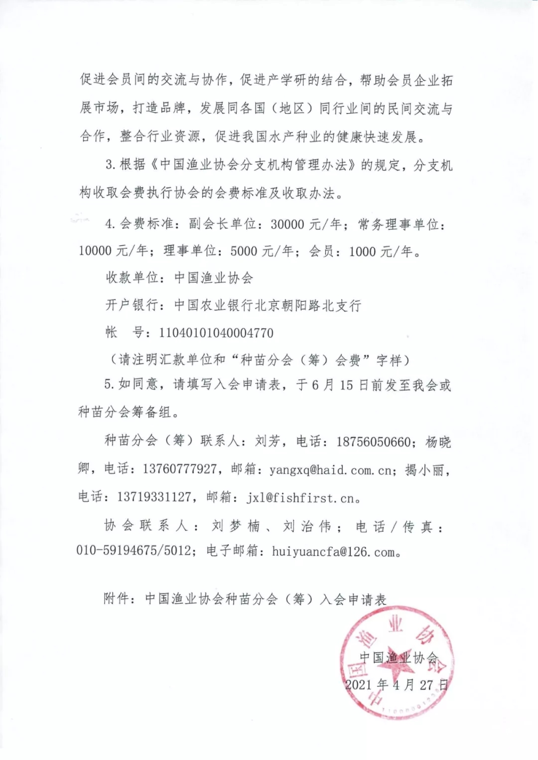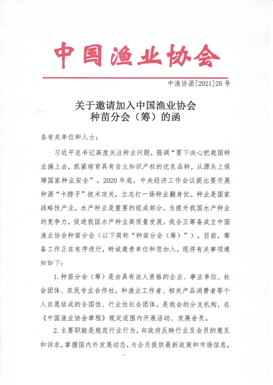 | 中國水產頻道報道, 成立大會初定6月底在廣州隆重舉行,歡迎大家加入! 種業是農業之“芯”。當下,國家已將種業提到前所未有的戰略高度。 為了把握難得機遇,推動中國水產種苗業大發展,經中國漁業協會審議,擬在協會框架內成立水產種苗分會,邀請包括幾大院士在內的國內水產種苗業頂尖的專家組成專家委員會,海大集團被推薦為會長單位,共鱗實業、通威、海壹、恒興、粵海、海茂、渤海水產、正大卜蜂、新榮騰、中正、寶路、海南晨海、廣東梁氏、嘉祐投資等約30家集團企業與國內頭部水產種苗相關企業為發起單位。 成立大會初定6月底在廣州隆重舉行,這將是水產種苗業主流力量的大聚會,現向全國水產種苗業相關企業發出正式入會邀請: 關于邀請加入中國漁業協會 水產種苗分會(籌)的函 各有關單位和人士: 習近平總書記高度關注種業問題,強調“要下決心把我國種業搞上去,抓緊培育具有自主知識產權的優良品種,從源頭上保障國家種業安全”。2020年底,中央經濟工作會議提出要開展種源“卡脖子”技術攻關,立志打一場種業翻身仗。種業是國家戰略性產業,水產種業是重要的組成部分。為提升我國水產種業的競爭力,促進我國水產種業高質量發展,我會正籌備成立中國漁業協會種苗分會(以下簡稱“種苗分會(籌)”)。目前,籌備工作正在有序進行,特誠邀貴單位和您加入,現將有關事項通知如下: 1.種苗分會(籌)是由具有法人資格的企業、事業單位、社會團體、農民專業合作社,和漁業工作者、相關產品消費者等個人自愿結成的全國性、行業性社會團體,是我會的分支機構,在《中國漁業協會章程》規定范圍內開展活動、發展會員。 2.主要職能是規范行業行為,向政府反映行業及會員的意見和訴求,掌握國內外發展動態,為會員提供最新政策和市場信息,促進會員間的交流與協作,促進產學研的結合,幫助會員企業拓展市場,打造品牌,發展同各國(地區)同行業間的民間交流與合作,整合行業資源,促進我國水產種業的健康快速發展。 3.根據《中國漁業協會分支機構管理辦法》的規定,分支機構收取會費執行協會的會費標準及收取辦法。 4.如同意,請填寫入會申請表(網上快速申請,可掃描下方“二維碼”,或點擊文末的“閱讀原文”填報),于6月15日前發至我會或種苗分會籌備組。 種苗分會(籌)聯系人: 揭小麗,電話:13719331127,郵箱:jxl fishfirst.cn; 楊曉卿,電話:13760777927,郵箱:yangxq haid.com.cn; 劉芳,電話:18756050660。 協會聯系人: 劉夢楠、劉治偉, 電話/傳真:010-59194675/5012, 電子郵箱:huiyuancfa 126.com。 中國漁業協會 2021年4月27日 |