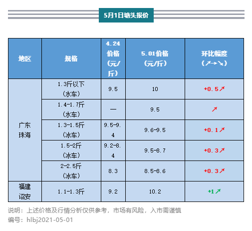 | 中國水產(chǎn)頻道原創(chuàng)報(bào)道, “五一”帶動(dòng)海鱸價(jià)格持續(xù)好市 文/水產(chǎn)前沿陳曉慶 價(jià)格走勢 “五一”黃金周的到來終于讓低迷已久的海鱸價(jià)格迎來了好市。本周珠海海鱸1.3斤下水車報(bào)價(jià)10元/斤,1.4-1.7斤報(bào)價(jià)9.5元/斤,相比上周上調(diào)了0.5元/斤。冰車價(jià)格方面,1.3-1.4斤規(guī)格報(bào)價(jià)9.6元/斤,1.4-1.5斤規(guī)格報(bào)價(jià)9.5元/斤,1.5-1.6斤規(guī)格報(bào)價(jià)9.5元/斤,1.6-1.7斤規(guī)格報(bào)價(jià)9.4元/斤,1.7-1.8斤規(guī)格報(bào)價(jià)9.2元/斤,1.8-1.9斤規(guī)格報(bào)價(jià)9元/斤,1.9-2斤規(guī)格報(bào)價(jià)8.7元/斤。2斤以上大魚報(bào)價(jià)8.5-8.6元/斤。2斤以下規(guī)格的魚相比上周上漲了0.3元/斤。 海鱸消費(fèi)主要依靠酒店宴席以及烤魚餐飲等,“五一”黃金周的到來帶動(dòng)消費(fèi)的提升。節(jié)前一周商家積極備貨,帶動(dòng)了魚價(jià)的上漲。上周末水車開塘9.5元/斤,而到了周一便漲到了10.5元/斤,隨著五一假期的到來,備貨期結(jié)束,加上堵車流通不暢,水車價(jià)格回落到10元/斤。 現(xiàn)在珠海存塘級魚少,小的太小,大的又偏大,正處于青黃不接的階段,這也是拉動(dòng)魚價(jià)上漲的主要原因。由于今年上半年海鱸價(jià)格長期低于成本價(jià),持有小規(guī)格的養(yǎng)殖戶控料嚴(yán)重,目前價(jià)格開始出現(xiàn)回升的跡象,養(yǎng)殖戶就會(huì)開始加料,保證禁漁期到來之時(shí)能夠有足規(guī)格的成魚供應(yīng)。 珠海海鱸水車價(jià)格走高,詔安海鱸價(jià)格也跟著上漲。 |