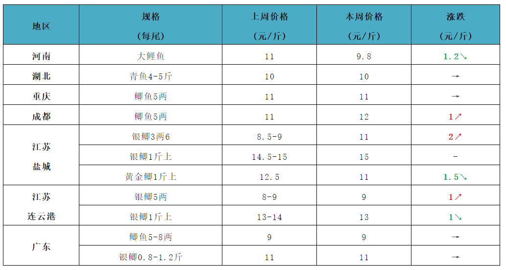 文/ 水產(chǎn)前沿 曾鈴程 鯽魚等其他淡水魚行情分析 水產(chǎn)前沿網(wǎng)原創(chuàng)報(bào)道,河南大鯉魚,節(jié)日需求過去,價(jià)格下跌,塘口價(jià)9.8元/斤。 湖北青魚塘頭價(jià)穩(wěn)定4-5斤,10元/斤。湖南鯽魚5兩起,11元/斤。 川渝等地,規(guī)格鯽魚貨少。重慶,5兩起,11元/斤。 成都,中科鯽,5兩起,12元/斤。 江蘇鯽魚,大魚少,小規(guī)格上市也不多,但是最近發(fā)病比較厲害,同時(shí)節(jié)日需求過去,行情有回調(diào)趨勢。 鹽城,銀鯽,3兩6,11元/斤;1斤上15元/斤;黃金鯽,7.6兩,9.5元/斤;1斤起,11元/斤。 宿遷,銀鯽8兩,14元/斤;黃金鯽,8兩,9.5元/斤。 連云港,銀鯽,5兩起,9元/斤;6兩起,10元/斤;8兩起,12元/斤;1斤上,13元/斤。 廣東鯽魚,5兩-8兩,一般9元/斤;8兩-1斤2,11元/斤。 編號:jybj2021-5-14 說明:上述價(jià)格及行情分析僅供參考,市場有風(fēng)險(xiǎn),入市需謹(jǐn)慎 養(yǎng)得好也要賣得好,特別感謝各位熱心朋友的信息支持和指點(diǎn)幫助! |