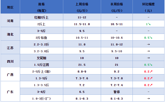 文/ 水產前沿 曾鈴程 鮰魚行情分析 江蘇北京貨2020-2021價格走勢 水產前沿網原創報道,河南等地價格下調,但大小不分。河南本地魚黑鮰,存塘魚少,5斤以下大小不分,塘頭價10.5-11元/斤。北京,少量出魚,2-3斤,11.6-11.8元/斤;3-5斤,10.5元/斤。 華中地區湖北黑鮰,價格下調。仙桃,貨少,2-3斤規格魚塘頭價10-10.6元/斤;1.5斤以上統貨,9元/斤。 江蘇等地鮰魚,價格穩定,新魚較少,存塘魚不多。目前2-3斤北京貨11.8-12元/斤;3斤以上超大魚9.5-10元/斤。 四川鮰魚。叉尾黑鮰,穩定,10元/斤;紅鮰,上漲,11.5元/斤。江團1.5-2.2斤,21元/斤。 廣東鮰魚,略有上浮。珠三角,1.3-3.5斤,7.2-7.4元/斤;1.8-3斤,1.9-3.2斤,8.1-8.3元/斤(加工廠價),量大可提價;3-6斤,暫停收魚。 廣西鮰魚,行情有點亂,部分規格略有上浮。北海,市場1.2-5斤,7.3-7.8元/斤;2-5斤,8.2元/斤;加工廠1-1.8斤,2.6-5斤,7元/斤;1.8-2.6斤,8元/斤。欽州,1.5-3.5斤,7.2-7.3元/斤;1.8-3.2斤,7.7-8元/斤。梧州,網箱鮰魚,2——5斤,9.2元/斤。 鮰魚最新價格 編號:jybj2021-6-4 說明:上述價格及行情分析僅供參考,市場有風險,入市需謹慎 養得好也要賣得好,特別感謝各位熱心朋友的信息支持和指點幫助! |