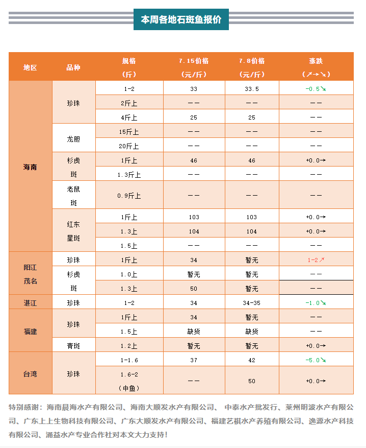 | 中國(guó)水產(chǎn)頻道原創(chuàng)報(bào)道, 本周內(nèi)石斑魚(yú)價(jià)格先下跌、后上漲,目前價(jià)格暫與上周持平 文/水產(chǎn)前沿 何鴻浩 行情簡(jiǎn)析 海南地區(qū):本周海南地區(qū)石斑魚(yú)價(jià)格走勢(shì)為下跌后再回升。其中珍珠斑已恢復(fù)至上周價(jià)位,目前珍珠1斤上規(guī)格報(bào)價(jià)33元/斤,僅下跌0.5元/斤,4斤上規(guī)格25元/斤,與上周持平;紅東星斑與上周持平,1斤上規(guī)格報(bào)價(jià)103元/斤,1.3斤上104元/斤;衫虎斑保持穩(wěn)定,1斤上規(guī)格報(bào)價(jià)46元/斤。海南業(yè)者表示,近兩天價(jià)格反彈,市場(chǎng)表現(xiàn)有所好轉(zhuǎn),交易量也好一些。與今年最高價(jià)3月上旬時(shí)的50元/斤相比,1-1.2斤規(guī)格的珍珠在4個(gè)月內(nèi)暴跌了17元/斤,如過(guò)山車(chē)般激烈起伏,也令業(yè)者心臟大跌不已。 廣東地區(qū):本周廣東地區(qū)石斑魚(yú)價(jià)格走勢(shì)與海南相似,同樣是先跌后張。湛江地區(qū)珍珠斑1斤上規(guī)格報(bào)價(jià)34元/斤;陽(yáng)江、茂名地區(qū)珍珠斑統(tǒng)貨34元/斤,衫虎斑1.3斤上規(guī)格50元/斤。據(jù)了解,本周魚(yú)價(jià)最低已跌破30元/斤關(guān)口,跌至29元/斤,價(jià)格是近兩日才重新漲回來(lái)的。陽(yáng)江、茂名地區(qū)從業(yè)者表示,魚(yú)價(jià)回暖給大家信心,現(xiàn)在各規(guī)格的存塘魚(yú)都有,7-8月可能會(huì)有一輪出魚(yú)小高峰,但真正集中出魚(yú)還是要等到春節(jié)前后。 一位湛江遂溪養(yǎng)殖戶表示:“價(jià)格總算恢復(fù)了,之前價(jià)格跌落30元的時(shí)候還是蠻擔(dān)心的,畢竟一個(gè)星期就跌了近10元/斤。但是,現(xiàn)在石斑魚(yú)存塘不多,我附近的中造魚(yú)也不多。我計(jì)劃過(guò)了這段淡季后,在9月份中秋節(jié)前后出魚(yú)。” 廣西地區(qū):近來(lái)廣西地區(qū)出魚(yú)少,暫無(wú)報(bào)價(jià)信息。當(dāng)?shù)貥I(yè)者表示,現(xiàn)在大規(guī)格魚(yú)比較少,總體以3、4兩規(guī)格為主,預(yù)計(jì)要到年底才會(huì)上市。 福建地區(qū):本周福建石斑魚(yú)呈現(xiàn)平穩(wěn)趨勢(shì),價(jià)格與其他地區(qū)相差不大。當(dāng)?shù)亓魍I(yè)者表示,魚(yú)價(jià)不可能一路走低,雖然現(xiàn)在價(jià)格還沒(méi)有上漲,但近來(lái)已有反彈的勢(shì)頭,而且價(jià)格低了養(yǎng)殖戶也不愿意賣(mài)魚(yú)。總體來(lái)說(shuō),福建價(jià)格還沒(méi)起來(lái),但市場(chǎng)已經(jīng)有所好轉(zhuǎn),后市還是有盼頭的。 臺(tái)灣地區(qū):本周臺(tái)灣地區(qū)珍珠斑價(jià)格出現(xiàn)較大跌幅,小規(guī)格珍珠斑報(bào)價(jià)為37元/斤。當(dāng)?shù)貜臉I(yè)者表示,此輪價(jià)格下跌的主要原因還是在于其他市場(chǎng)的影響,也符合前期的判斷。但同時(shí)也有一個(gè)好消息,雖然近期浮動(dòng)區(qū)間震蕩較大,但市場(chǎng)反應(yīng)基本見(jiàn)底,后市再有較大振幅的可能性并不大。 |