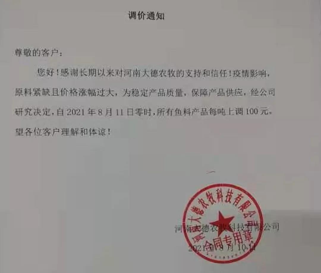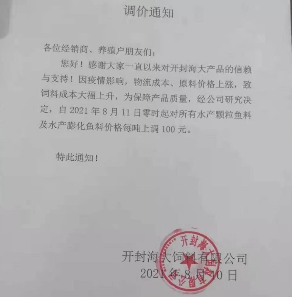 文/ 水產(chǎn)前沿 整理 水產(chǎn)前沿網(wǎng)原創(chuàng)報道,受疫情影響,多省如江蘇、湖南、河南等飼料原料、飼料成品、商品魚蝦運輸困難,運費翻倍暴增,如江蘇隨著司機流動量大,行程碼上帶星(去過中低風險)的司機越來越多,就都要48小時核酸檢測。知情人士稱,現(xiàn)在能跑的司機越來越少了運費翻倍暴漲,7-8天(或更長時間)才找到一輛運料車。 另外,進入8月來,水產(chǎn)養(yǎng)殖正值投料旺季,原料價格也在上漲,除了上述地區(qū)飼料價格大漲外,還有廣西、山東等地也漲了,這一波又接一波的,根本停不下來...... 華東飼料持續(xù)漲價,今天最高漲300元/噸 據(jù)了解今天(8月15日),華東地區(qū)有部分料企上漲對蝦料(普通料和高端料)、蝦蟹料,漲幅為對蝦普通料上漲200元/噸、對蝦高端料上漲300元/噸、蝦蟹料上漲150元/噸。 寧波天邦飼料漲價通知 江蘇海大日前漲價通知 華中8月20日特水魚、蝦料、龜鱉料漲價,最高漲300元/噸 此外,華中湖南地區(qū)也在持續(xù)漲價,昨天湖南粵海發(fā)布漲價消息,由于近期原料價格、運輸成本大幅上漲,從2021年8月20日零時起,加州鱸料、黃顙魚料、翹嘴料、蛙料、泥鰍料、草蝦料、對蝦料漲價200元/噸,龜鱉料漲價300元/噸。 湖南粵海飼料漲價通知 疫情影響,物流成本、原料價格上漲,河南飼料漲價100元/噸 同樣,在河南地區(qū),因疫情影響,物流成本、原料價格上漲,飼料成本大幅上升,8月11日起,多個料企包括開封海大、河南康達爾、河南大德、河南王牌、河南金碩康都同步上漲了顆粒料、膨化料,漲幅為100元/噸。 開封海大飼料漲價通知 河南康達爾飼料漲價通知 河南大德飼料漲價通知 河南王牌飼料漲價通知 河南金碩康飼料漲價通知 山東蝦料、蝦蟹料漲300元/噸 8月13日,青島六和飼料有限公司、海陽新希望六和飼料有限公司兩個料企,同一個聚落發(fā)布漲價通知,蝦料、蝦蟹料均漲300元/噸。 膠東聚落飼料漲價通知 13日,廣西普通魚料(苗料)漲3元/包 廣西澳華飼料漲價通知 |