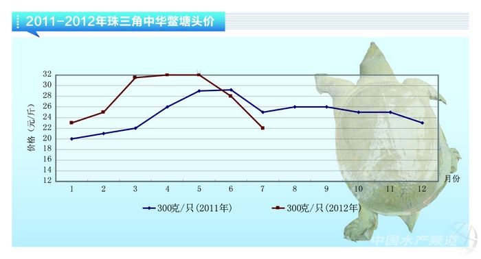 進入炎熱的夏季,甲魚進入傳統消費淡季,由于沒有成交量,再加上轉外塘處理的病魚今年特別多,魚價小幅走低。7月11日,江浙一帶溫室甲魚平均8兩的統貨17.3元/斤左右。廣東地區臺灣甲魚6兩以上,22元/斤。1斤以上,平均1.8斤中華公魚,41元/斤。2斤以上,平均2.5斤,公魚,46元/斤,但銷量不好,比上月均有所下跌。溫室甲魚目前價格已處今年低位,8月立秋后,價格有望隨銷量增加好轉。
