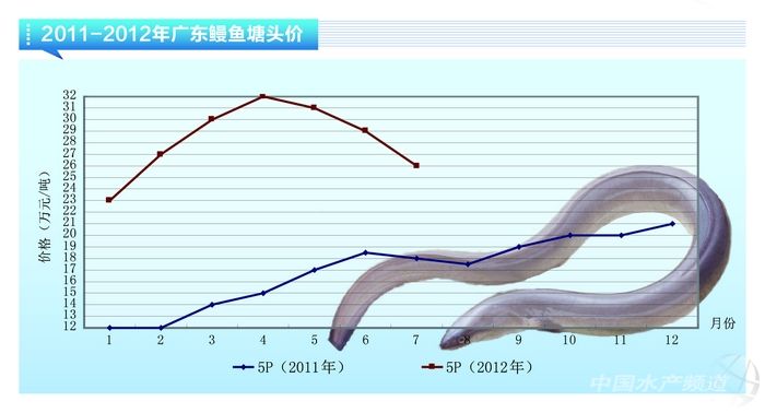 7月上旬,廣東菜鰻塘頭價價格下跌2萬元/噸,為11萬元/噸,5p規格活鰻降至7月上旬的26萬元/噸;5p歐洲鰻也有所下降,基本15.8萬元/噸左右波動。而對日出口活鰻價5p規格也下降了一定的幅度,6月上旬3850日元/公斤。