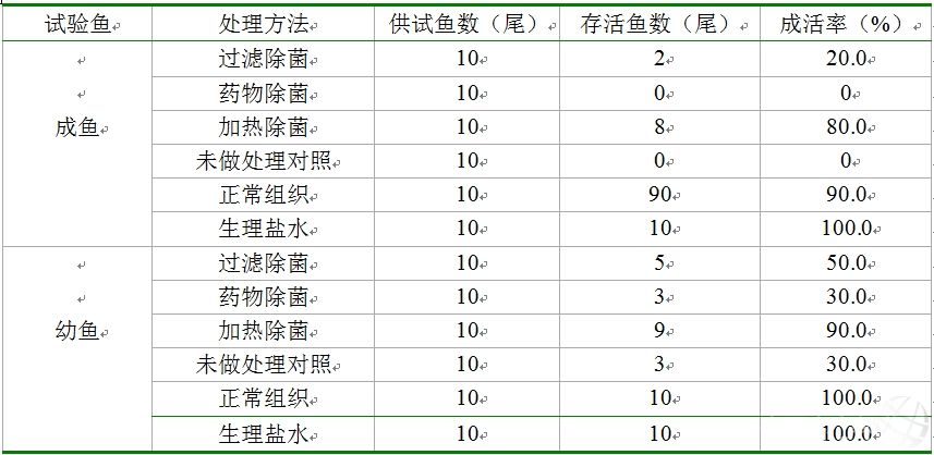 圖1 患“鰓出血病”的銀鯽 由于我國過去對銀鯽病害防治研究基礎比較差,對引起暴發性疾病的原因尚不清楚。廣大養殖業者面對突然暴發的銀鯽疾病缺乏適宜的防治對策,一些針對水產養殖動物疾病的常規防治措施,如采用生石灰和氯制劑消毒及內服抗生素等,均難以有效控制銀鯽“鰓出血病”的蔓延。 探明銀鯽暴發性鰓出血病的病原,是做到對癥施治、有效地控制該病的前提。本研究從發病養殖池塘收集具有典型病癥的銀鯽,將患鰓出血病銀鯽鰓組織與內臟組織取出來,勻漿后離心并收集其上清液。通過利用不同的方法處理上清液后制備成帶有不同種類病原的組織漿上清液,將其作為感染源注射接種健康銀鯽后,根據供試銀鯽發生疾病和死亡的狀況,推測出人工養殖銀鯽“鰓出血病”的病原可能是某種病毒。現將試驗結果報道如下。 1 材料與方法 1.1 試驗健康銀鯽來源及試驗設計 從江蘇省鹽城地區射陽黃沙港養殖區采集的身體無損傷、色澤正常、健康活潑的銀鯽作為本研究試驗魚。依據銀鯽體重將試驗魚分為2個不同的規格,即將體重為(280.0±13.0)g的銀鯽作為試驗成魚組,體重為(87.0±9.0)g的銀鯽作為試驗幼魚組。將供試銀鯽分別飼養于塑料水族箱中,預備飼養7 d后,從各組銀鯽中選擇無任何不良癥狀的銀鯽作為本次試驗用魚。每個規格的試驗魚設5個組。在每個盛有1.5 M3的塑料水族箱中放養10尾銀鯽。在預備飼養期間,在各水族箱中控制水溫變化在22~26℃之間,用充氣泵24 h 連續充氣,早、晚各投喂鹽城裕達飼料有限公司生產的鯽全價飼料各1次。 1.2 患病銀鯽來源與感染源制備 具有暴發性疾病典型癥狀的患病銀鯽從鹽城地區射陽縣黃沙港水產養殖區某養殖池塘中獲得。將患病銀鯽解剖后取出鰓組織和肝、脾、腎臟等內部器官,利用電動攪肉機將這些鰓組織和內部器官進行組織勻漿后離心并收集上清液,將收集的上清液均分為4份盛裝在三角燒瓶中。將第1份上清液在濾菌器中經孔徑為0.22µm的濾菌膜過濾,除去其中細菌后作為濾菌上清液樣品;在第2份上清液中加入青霉素和鏈霉素(Difco),使這2種抗生素在上清液中的濃度分別達到100.0µg/g,殺菌處理30 min后作為殺菌上清液樣品;將盛裝第3份上清液的三角燒瓶置于100℃水浴鍋中,保持1 h以殺滅其中的細菌和病毒后,作為加熱殺菌上清液樣品。用移液器分別在第1份、第2份和第3份上清液樣品中,分別取100.0µL上清液接種在BHIA(Difco)平皿中,在25℃培養箱中培養48 h,證實3種上清液樣品中沒有存活細菌后,作為不同處理的試驗組注射上清液樣品,如果有菌落出現則將該樣品棄之不用。對第4份組織漿液不作任何處理,作為有細菌和病毒試驗組注射上清液樣品。另外,選擇10尾無任何癥狀50.0g左右的銀鯽,依上述方法制備組織漿和上清液,不做任何處理即作為第5份未經處理的正常組織漿液上清液。制作好的上清液樣品均保存在4℃冰箱中,備用。 1.3 注射上清液接種 采用經過胸鰭基部注射的方法接種上述各種組織漿上清液,對試驗成魚組每尾供試魚注射0.3mL,而對試驗幼魚組每尾供試魚注射0.2mL。將注射濾菌上清液樣品的供試魚作為試驗1組;注射藥物殺菌上清樣品作為試驗2組;注射熱滅活上清樣品的供試魚作為試驗3組,注射未經處理的患病魚組織上清液樣品的試驗魚作為第4組,注射未經處理的正常魚組織上清液樣品的試驗魚作為第5組,將注射0.7%的滅菌生理鹽水的試驗魚作為對照組。注射結束后仍然放回水族箱中繼續飼養。 1.4 用感染后患病銀鯽制備組織漿上清液后人工再接種 從人工注射患病銀鯽組織漿上清液后,發生“鰓出血病”典型癥狀的銀鯽中選取數尾魚,按照1.2項中所述方法制備患病與正常魚組織漿上清液后,按照1.3所述方法再次注射接種供試銀鯽。以觀察供試銀鯽的疾病發生與死亡狀況。 1.5 飼養觀察 對經過注射接種后各規格的試驗組銀鯽按照體重的2.0%投喂飼料,每天早晚各1次。自注射結束后開始計算,連續飼養觀察14 d,記錄供試銀鯽疾病發生狀態以及死亡發生的時間。 2 結果 2.1 注射病魚組織上清液后銀鯽發病與死亡狀況 采用不同方式處理后的病魚組織上清液注射不同規格銀鯽后,供試銀鯽疾病發生狀態和死亡時間狀況見表1。從表1可以看出,經過接種經不同方法處理的患病與正常銀鯽組織漿上清液后,成魚發病和死亡率均比幼魚高。接種過濾除菌組試驗成魚在14d的觀察期內,僅有20.0%的存活率,藥物處理組試驗成魚100.0%死亡,加熱處理組試驗成魚只有80.0%存活率,未做處理對照組試驗成魚全部死亡,注射正常組織上清液的試驗成魚有90.0%存活,而注射滅菌生理鹽水的對照成魚100.0%存活。 表1 注射各種處理的患病銀鯽組織漿上清液后不同規格銀鯽成活率