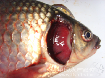 圖2 患“大紅鰓”的銀鯽 星出現,發病時間從5月初開始,瀕死魚“黑頭”較多。除感染危害銀鯽外,還可感染草魚及團頭魴。患“大紅鰓”病魚的鰓絲呈現鮮紅色,當患病魚體離水數分鐘后鰓絲即轉為暗紅色,一般有出現“花鰓”的現象,鏡檢通常發現鰓上有指環蟲,解剖發現內部器官出現不同程度的糜爛,有比較多的淡黃色透明腹水。患病池塘大多用過刺激性較強的殺蟲藥物,發生“大紅鰓”病后銀鯽的死亡量較大,但是,通過采用微生態制劑等改善水質環境、二氧化氯等消毒劑進行水體消毒,同時選擇對致病菌敏感的抗生素類藥物投喂,可以有效地緩解這種疾病的蔓延速度。 另一種癥狀主要是呈現“鰓出血”的癥狀,這種疾病自2009年開始最先在射陽周邊的養殖場出現。發病時間從4月初即開始,主要感染100.0g以上的銀鯽,表現為鰓部嚴重充血,嚴重時出現鰓部向外噴血的現象(圖3),將具有典型癥狀的瀕死魚提離水面時,鰓部