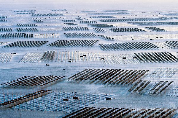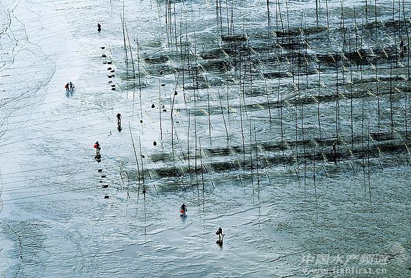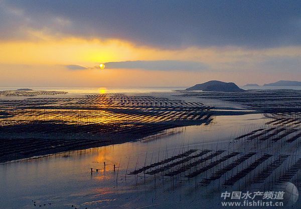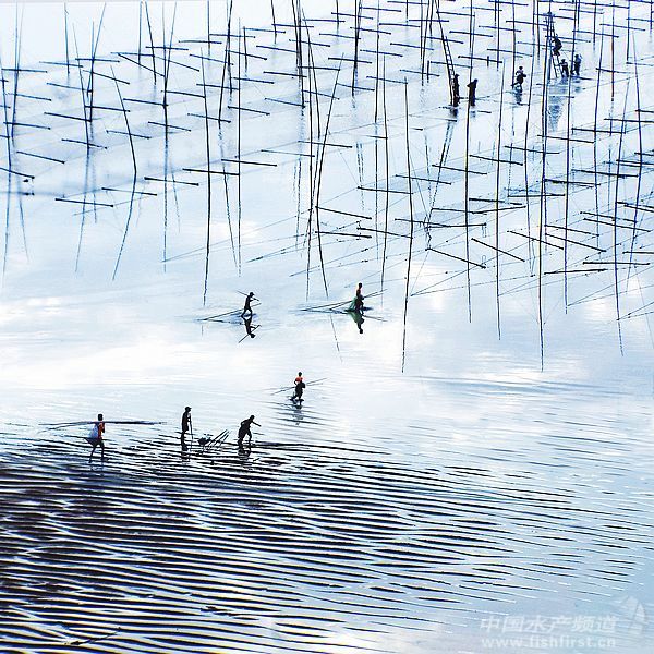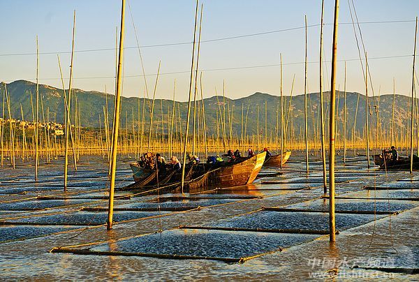 三沙古鎮港紫菜場 文/圖 中國水產頻道撰稿人何興水 中國水產頻道獨家報道,霞浦漫長曲折的海岸線為這里創造出眾多的天然港灣,近海海域成為種植紫菜的一座座天然水上農場。霞浦全縣紫菜種植面積有5萬畝,紫菜年產量1萬噸,年產值4億元。三沙港紫菜種植面積占了半壁江山,從西南浮山村到東北青官司村35公里海岸線紫菜場延綿天際,蔚為壯觀。霞浦出產的紫菜無沙色澤鮮亮、口感鮮嫩,色香味俱全,是中國紫菜珍品,而三沙紫菜品質又優于霞浦其他鄉鎮。紫菜以日出之前采收,當日日曬成品是為珍貴上品,只有少量漁民自曬饋贈親友以及在本地市場少量銷售,由于產量大絕大部分由加工廠烘干成品。 霞浦紫菜養殖的迅速發展,一是得益自然環境:霞浦海域優良水質、適宜的海潮流速、以及充足的自然有機養分和適宜的溫度環境,生產出最優質紫菜。二是紫菜營養價值高,越來越為專家和民眾所認可的健康綠色食品。央視一部關于中國各地飲食文化的專題紀錄片《舌尖上的中國》火爆銀屏,“霞浦紫菜”是福建唯一在節目中介紹到的美食,讓霞浦紫菜在自然與人文光環下更加生動與樸實,讓人更深刻地體會到紫菜雖是一道貌似簡單的食品,卻最真實地帶來了大海的美好風味。把飯桌上不起眼的佐菜提升到應有的中國飲食文化品位。 中秋前后,秋高氣爽,漁民更繁忙起來。他們在海涂上規劃擴建紫菜養殖場,沿海全線都有養殖場,每個海灣的養殖場都是一直延續到天邊。漁民或拉竿或掛苗繩, 海面船只穿梭,滿灘滿海都是竿影人影船影,漁民勞作頻繁,一派繁忙的景象。整整操勞了一個月,之后漁民邊養護邊收獲延續到來年春天。紫菜苗繩初下水時呈白色,逐漸變黃變綠變黑,這是紫菜生長過程變化,45天,也就是一個半月,第一水的紫菜就可收獲,而后每半個月左右又長出第二水,可收獲5-6水,漁民一水一水地收獲美夢和希望。 你看,那忙碌的人是點,而網竿形成了線與面,正是這點線面組成一幅幅美麗的畫面。這畫面是勞動的杰作,是錦繡的編織,是海的詩行,而在我的眼里是階梯了。海潮初漲,淡淡的云光波光鱗鱗交織疊錯晃悠,點綴著舟影人影,仿佛天界,合十祁福,我的父老鄉親帶上希望夢走天階,建設家園天堂。 霞浦又是中國最美的海岸灘涂,攝影界公認的攝影圣地,我從事攝影,因為攝影因為故鄉霞浦,我和許許多多海內外攝影人走到一起,記錄霞浦獨特的自然風光和人文景觀,紫菜題材是霞浦攝影的一大亮點。