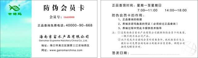 吉諾瑪公司為了答謝10多年來客戶對公司的支持與厚愛,公司計劃于2013年1到3月進行“吉諾瑪送春暖”行動,凡在期間購買吉諾瑪羅非魚苗的客戶,即可當場享受到吉諾瑪公司贈送魚苗的活動,藉此來回饋客戶對吉諾瑪公司的支持。 具體細則請廣大養殖戶朋友向當地經銷商進行咨詢,也可以打公司電話免費咨詢熱線40000—90—668進行咨詢。同時公司2013年1月1日開始推出防偽會員卡,確保大家養殖真正的吉諾瑪,推出防偽會員卡的詳細說明如下: 由于市場上假冒吉諾瑪羅非魚苗的現象非常猖獗,嚴重的影響了吉諾瑪的口碑和形象,眾多養殖戶因為購買到了假冒的吉諾瑪產品而蒙受了經濟上的巨大損失。為了杜絕這種現象,海南吉富水產品有限公司自2013年1月1日起推出防偽會員卡(如下圖),防偽會員卡實施細則如下:
