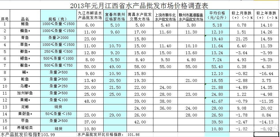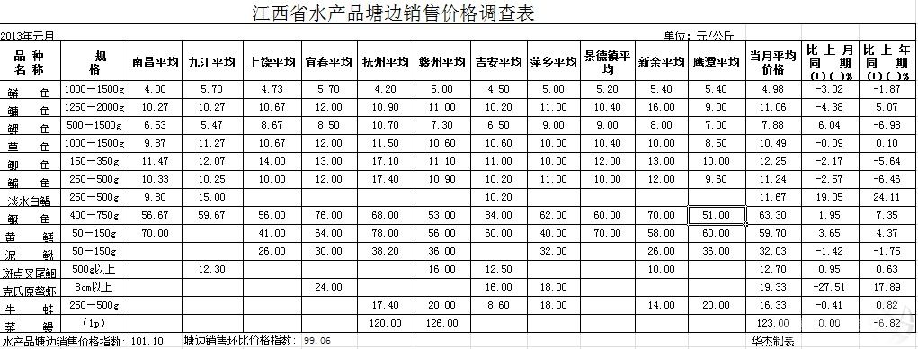 一、水產(chǎn)品價(jià)格走勢(shì)基本情況及特點(diǎn) 中國(guó)水產(chǎn)頻道獨(dú)家報(bào)道,1、市場(chǎng)零售價(jià)格:通過(guò)對(duì)江西省14個(gè)水產(chǎn)品零售市場(chǎng)19個(gè)水產(chǎn)養(yǎng)殖品種的調(diào)查,2013年元月份江西水產(chǎn)品市場(chǎng)零售同比價(jià)格指數(shù)為93.42,跌6.58%;環(huán)比價(jià)格指數(shù)為101.43,漲1.43%。與上年同期相比,只有一個(gè)品種上漲,青魚21.10元/公斤,漲4.40%。列同比跌幅前5位的品種是:養(yǎng)殖蛙類16.42元/公斤,跌16.86%;甲魚51.15元/公斤,跌14.34%;鰻魚142.00元/公斤,跌13.41%;;鯉魚9.65元/公斤,跌11.10%;本地鯰魚23.43元/公斤,跌11.04%(詳見(jiàn)附表)。 2、市場(chǎng)批發(fā)價(jià)格:通過(guò)對(duì)江西省內(nèi)三個(gè)部級(jí)定點(diǎn)價(jià)格采集批發(fā)市場(chǎng)及二個(gè)省級(jí)定點(diǎn)價(jià)格采集批發(fā)市場(chǎng)共16個(gè)水產(chǎn)養(yǎng)殖品種的價(jià)格采集,2013年元月,江西省水產(chǎn)品批發(fā)價(jià)格指數(shù)為103.99,同比漲幅為3.99%;環(huán)比價(jià)格指數(shù)為101.86,環(huán)比略漲1.86%。與去年同期相比,列漲幅前五位的是:泥鰍28.00元/公斤,漲20.02%;青魚19.40元/公斤,漲14.59%;烏鱧21.88元/公斤,漲14.35%;鳙魚12.10元/公斤,漲14.26%;鰱魚5.18元/公斤,漲14.10%;(詳見(jiàn)附表)。 3、塘邊出水價(jià)格:根據(jù)對(duì)江西省十一個(gè)設(shè)區(qū)市的21個(gè)縣(市、區(qū))的17家水產(chǎn)養(yǎng)殖場(chǎng)、4家水產(chǎn)養(yǎng)殖大戶共14個(gè)養(yǎng)殖品種的調(diào)查,2013年元月,江西省塘邊起水價(jià)格同比價(jià)格指數(shù)為101.10,同比上漲了1.10個(gè)百分點(diǎn);環(huán)比價(jià)格指數(shù)為99.06,環(huán)比略跌0.94個(gè)百分點(diǎn)。在所有監(jiān)測(cè)品種中,同比下跌品種有6個(gè),其余監(jiān)測(cè)品種上漲,列漲幅前五位的品種是:淡水白鯧11.67元/公斤,漲24.11%;克氏原螯蝦(小龍蝦)19.33元/公斤,漲17.89%;鱖魚63.30元/公斤,漲7.35%;鳙魚11.06元/公斤,漲5.07%;黃鱔59.70元/公斤,漲4.37%(詳見(jiàn)附表)。 二、水產(chǎn)品價(jià)格走勢(shì)情況 從三大價(jià)格采集情況看,本月江西省的水產(chǎn)品市場(chǎng),價(jià)格總體平穩(wěn),市場(chǎng)魚貨充足,交易活躍。雖然水產(chǎn)品三大價(jià)格同比及環(huán)比漲跌互現(xiàn),但總體則是穩(wěn)中略漲的格局。從交易情況來(lái)看,受春節(jié)臨近的影響,市場(chǎng)需求量同比略增,供應(yīng)量環(huán)比增幅明顯,同時(shí),外省入贛的商品魚供應(yīng)量環(huán)比也相應(yīng)增加。隨著市場(chǎng)供應(yīng)的增加,盡管消費(fèi)需求量也在增長(zhǎng),但水產(chǎn)品價(jià)格的增長(zhǎng)速度也會(huì)明顯下降,建議廣大養(yǎng)殖者特別是大型養(yǎng)殖基地做好合理的市場(chǎng)供應(yīng)安排,有條件的養(yǎng)殖戶,盡量推遲起捕時(shí)間,以免因集中上市而導(dǎo)致價(jià)格下滑。(文/中國(guó)水產(chǎn)頻道 通訊員 農(nóng)業(yè)部特聘水產(chǎn)市場(chǎng)分析專家 華 杰)