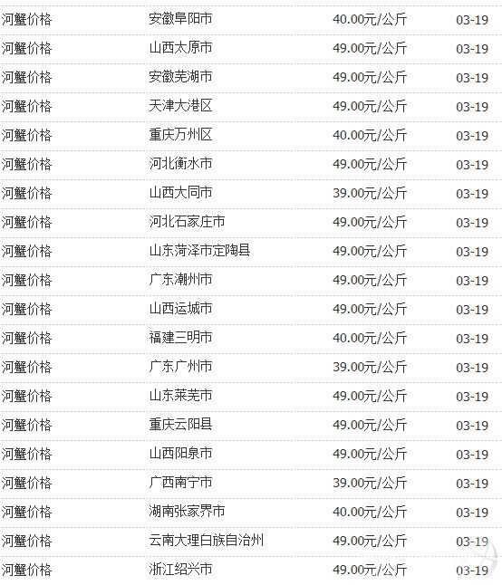 中國水產頻道獨家報道,3月19日國內部分地區河蟹價格統計如下: