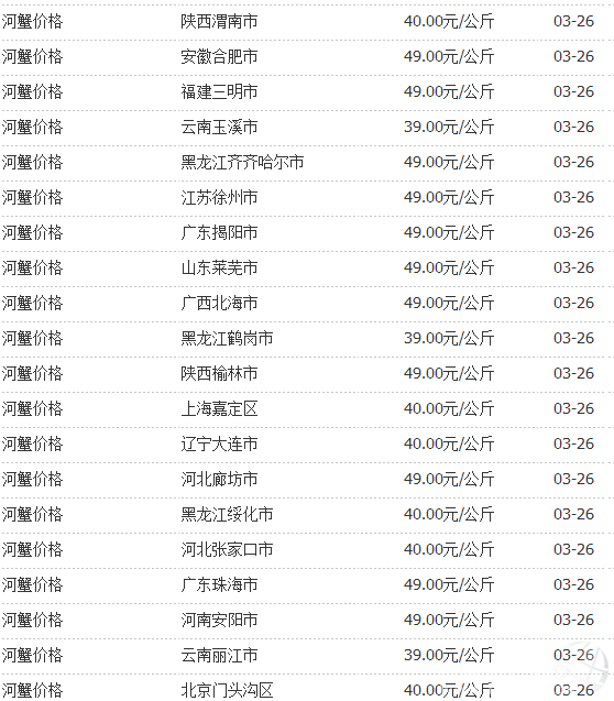 中國水產頻道獨家報道,3月26日國內部分地區河蟹價格統計如下: