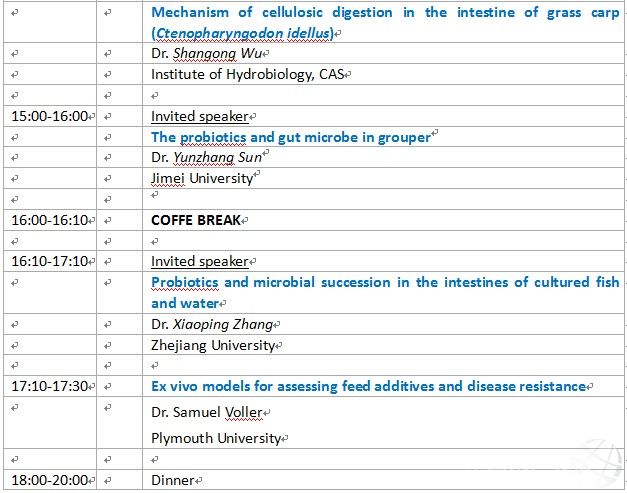 WORKSHOP Interaction between GI tract microbe and piscine host 消化道微生物與魚源宿主互作國(guó)際研討會(huì) Beijing, China•9-10 April 2013 ORGANIZER 1Innovative Direction of Aqua Feed & Feed Additive, 2Key Laboratory for Feed Biotechnology of the Ministry of Agriculture, Feed Research Institute of Chinese Academy of Agricultural Sciences Background: A more complete use of food resources and available space is achieved in the present aquaculture system, particularly in China. However, such aquaculture mode always results in high stocking density and consequently may depress the immune system (cellular and humoral immune) of piscine host and increases their susceptibility to diseases. It has been known that the gut microbe plays an important role in providing nutrients, regulating epithelial development, and instructing innate immunity. However, although more and more scientists are revealing the full pictures of these biological effects, we still know few about the characterization/mechanism of these interactions. The purpose of this workshop is attempted to provide an overview of “Interaction between GI tract microbe and piscine host”, including (but not limited to); a) Techqiues to encode gut microbe; b) The physiological structures of fish gastrointestines and where is the gut microbe (allo, auto, invasion, translocation, etc.); c) Interaction between gut microbe and host fish (nutrition, immunity, disease protection, endocrine, etc.); d) Different testing models (in vivo, in vitro, ex vivo, cells; gnobiotic animals); e) The future of this field. Organized by: Innovative Direction of Aqua Feed & Feed Additive, Key Laboratory for Feed Biotechnology of the Ministry of Agriculture, Feed Research Institute of Chinese Academy of Agricultural Sciences. Supported by: The Technology Support Program Project of China (grant #2012BAD25B02); The Modern Agricultural Industry Technology System of Beijing City (grant #SCGWZJ 20121104-4); The 948 project of MOA, China (grant #2012-Z8); The National Natural Science Foundation of China (grant #31272672). Exclusive sponsorship: Novus International, Inc. Venue/Contact: The conference room in the1st floor of the Feed Research Institute of Chinese Academy of Agricultural Sciences, Beijing, China; Mr. Suxu He, email: hesuxu@caas.cn, phone: +86-10-82106089. PROGRAM Tuesday 9 April Wednesday 10 April |