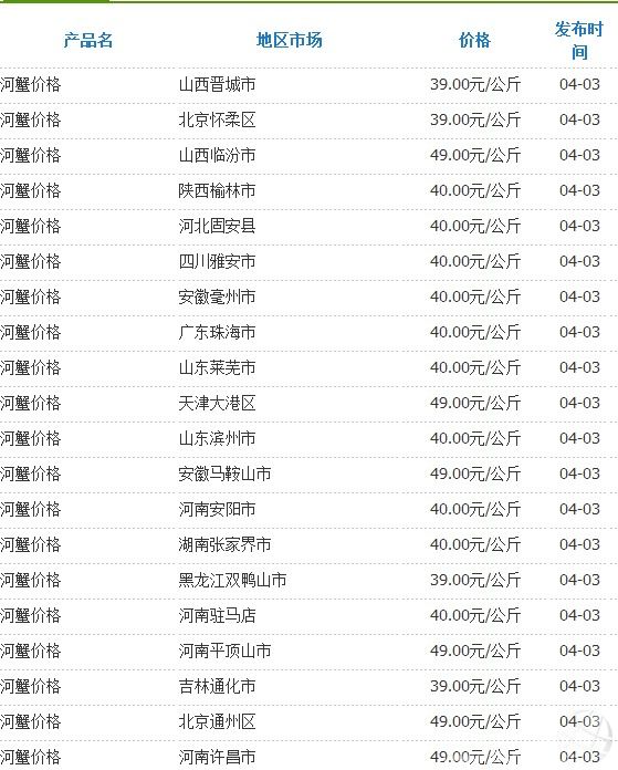 4月3日國內部分地區河蟹價格統計