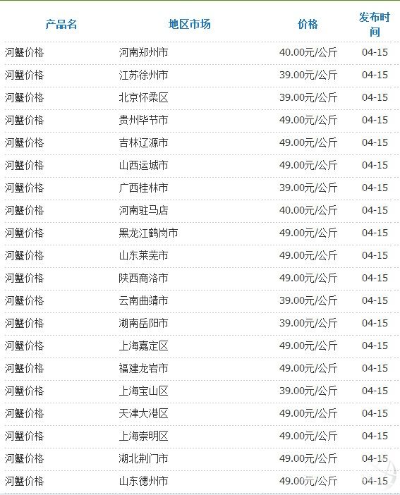 中國水產頻道獨家報道,4月15日國內部分地區河蟹價格統計如下: