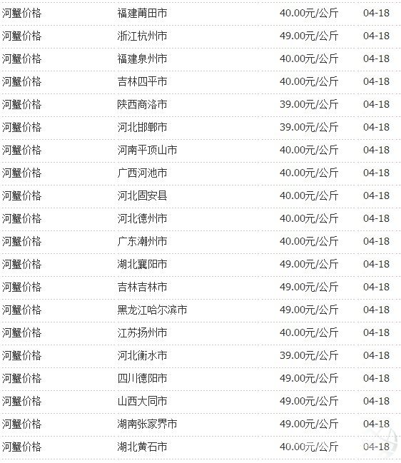 4月18日國內(nèi)部分地區(qū)河蟹價格統(tǒng)計