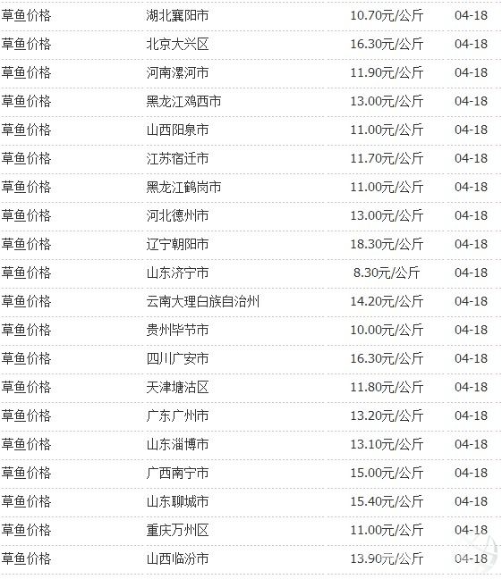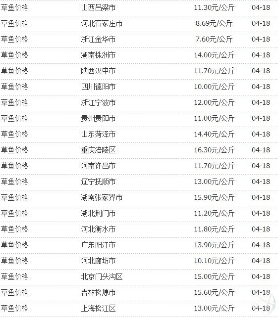 中國水產頻道獨家報道,4月18日國內部分地區草魚價格統計如下: