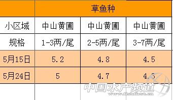 中國水產頻道獨家報道,據海大集團華南魚料部提供資料顯示5月15-24日中山黃圃草魚魚種價格情況如下:
