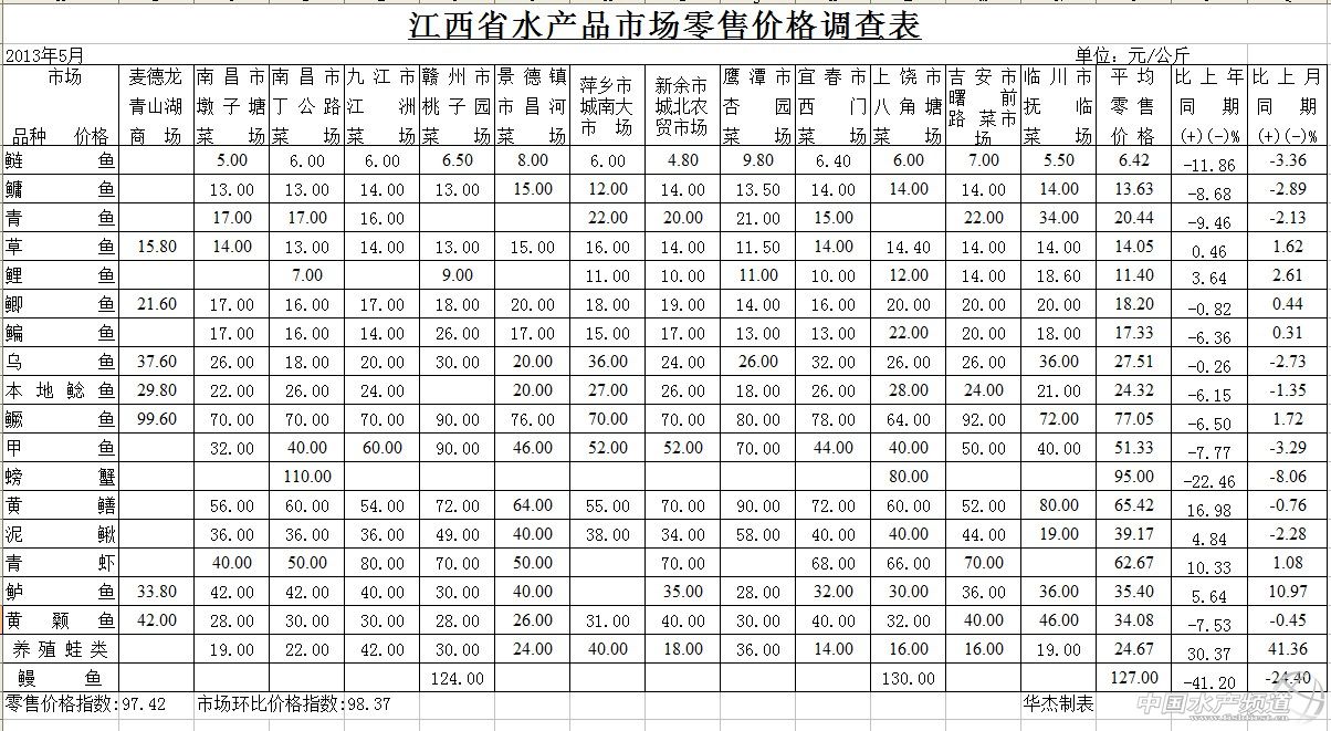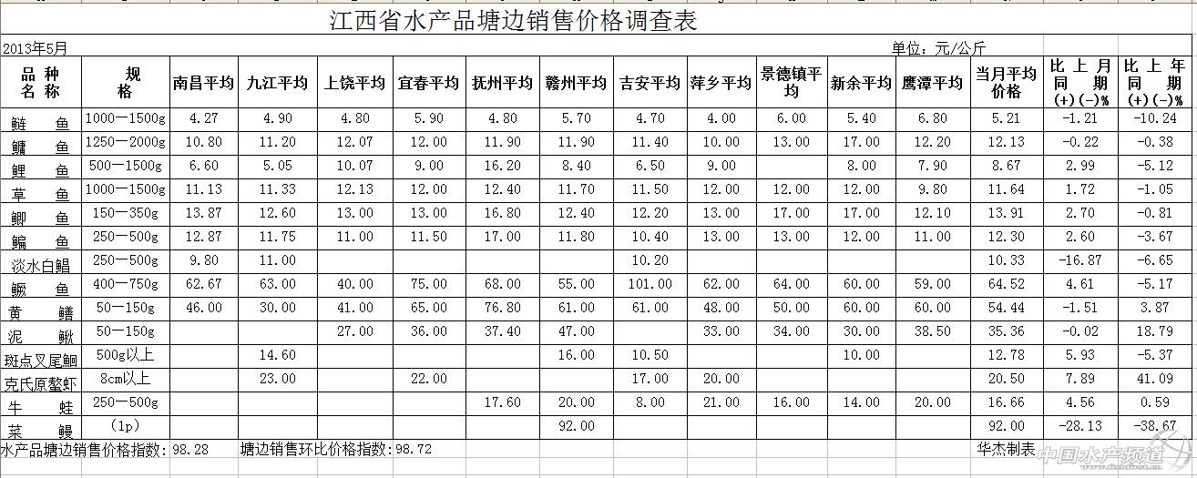 1、市場零售價格:通過對江西省14個水產品零售市場19個水產養殖品種的調查,2013年5月份江西水產品市場零售同比價格指數為97.42,較上年同期下跌2.58%;環比價格指數為98.37,較上月下跌1.63%。與上年同期相比,列同比跌幅前5位的品種是:鰻魚127.00元/公斤,跌41.20%;河蟹95.00元/公斤,跌22.45%;鰱魚6.42元/公斤,跌11.86%;青魚20.44元/公斤,跌9.46%;鳙魚13.63元/公斤,跌8.68%(詳見附表)。 2、市場批發價格:通過對江西省內三個部級定點價格采集批發市場及二個省級定點價格采集批發市場共16個水產養殖品種的價格采集,2013年5月,江西省水產品批發價格指數為106.06,同比漲幅為6.06%;環比價格指數為104.35,環比漲4.35。與去年同期相比,列漲幅前五位的是:牛蛙19.75元/公斤,漲88.10%;青魚17.00元/公斤,漲11.11%;泥鰍31.00元/公斤,漲10.71%;鯰魚21.50元/公斤,漲8.86%;鯉魚7.63元/公斤,漲8.00%(詳見附表)。