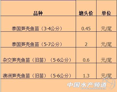 中國水產頻道獨家報道,6月14日珠三角地區筍殼魚魚苗塘頭價如圖所示: