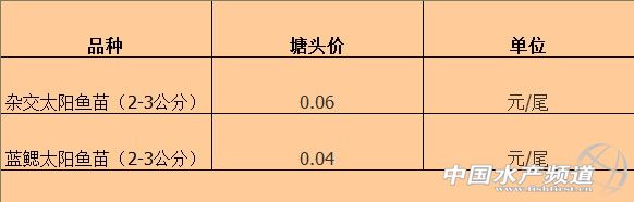 中國水產頻道獨家報道,6月14日珠三角地區太陽魚魚苗塘頭價如圖所示: