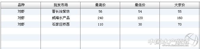 摘要: 中國水產頻道獨家報道,7月2日全國主要批發市場對蝦價格行情 (中國水產頻道水產價格信息共享Q群:245296163,歡迎提供各種水產品一線價格信息!)【關鍵字】:對蝦價格行情批發市場  中國水產頻道(www.fishfir ...