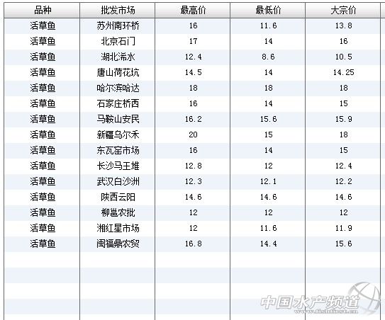 中國水產頻道獨家報道,7月15日全國主要批發市場活草魚價格行情如下: