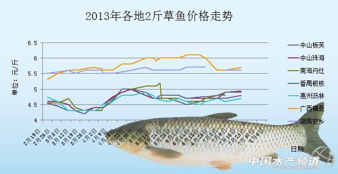 中國水產頻道獨家報道,據海大集團華南魚料部提供資料顯示,7月6日-18日各地區2斤草魚價格情況如圖所示: