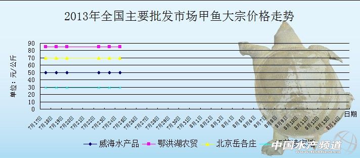 中國(guó)水產(chǎn)頻道獨(dú)家報(bào)道,7月24日全國(guó)主要批發(fā)市場(chǎng)甲魚(yú)價(jià)格行情如下: