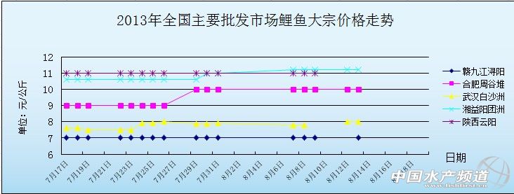 中國水產(chǎn)頻道獨家報道,8月13日全國主要批發(fā)市場鯉魚價格行情如下: 全國主要批發(fā)市場大宗價格 日期 產(chǎn)品 批發(fā)市場 大宗價格 單位 8月13日 鯉魚 湖北武漢白沙洲 8 元/公斤 8月13日 鯉魚 江蘇徐州七里溝 9.3 元/公斤 8月13日 鯉魚 山東威海水產(chǎn)品 13 元/公斤 8月13日 鯉魚 山東青島撫順路 13 元/公斤 8月13日 鯉魚 江西九江潯陽 7 元/公斤 8月13日 鯉魚 山西晉城綠欣 10.5 元/公斤 8月13日 鯉魚 四川廣安鄰水 15 元/公斤 8月13日 鯉魚 四川成都農(nóng)產(chǎn)品 10.4 元/公斤 8月13日 鯉魚 新疆北園春 12 元/公斤 8月13日 鯉魚 安徽合肥周谷堆 10 元/公斤 8月13日 鯉魚 湖南益陽團洲 11.2 元/公斤 8月13日 鯉魚 湖南長沙馬王堆 9.5 元/公斤 8月13日 鯉魚 北京石門 10 元/公斤 8月13日 鯉魚 廣西柳邕農(nóng)批 12 元/公斤 8月13日 鯉魚 河北魏縣天仙 11 元/公斤 8月13日 鯉魚 福建福鼎農(nóng)貿(mào) 16 元/公斤 8月13日 鯉魚 山東濱州六街 11 元/公斤 | |||||||||||||||||||||||||||||||||||||||||||||||||||||||||||||||||||||||||||||||||||||||||||||||