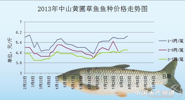 中國水產頻道獨家報道,據海大集團華南魚料部提供資料顯示,8月19日中山黃圃草魚種價格情況如圖所示: