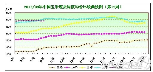 中國水產頻道報道,據上海益農訊,2013年第12周(3月18日-3月22日)本周,玉米市場上量持續增加,而收購主體收購相對謹慎,價格延續偏弱走勢。益農監測第12周全國均價在2358.00元/噸,較上周下跌0.24%。 ![]() 圖表:2013年第12周中國局部市場玉米現貨周度均價比較統計表(單位:元/噸)
