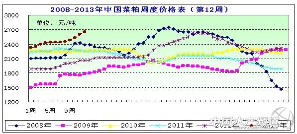 中國水產頻道報道,據上海益農訊, 一、市場概述 本周(2013年/3/15-3/22)本周初國內現貨菜粕價格延續強勢格局,同時廠家由于現貨不多而挺價心態明顯。菜粕的現貨價格延續強勢并給期價以支撐。隨著目前豆粕下跌空間已經打開,以及月底巴西豆及菜籽的到港,緊張態勢或逐步得到緩解,預計對菜粕壓力將逐步顯現。本周菜粕現貨市場局部繼續走高,市場貨源逐步減少。本周菜粕均價在2648元/噸左右,周度均價呈穩定上漲趨勢。 圖表:2013年3月第3周(3月15日-3月22日,總第11周)中國主要地區菜粕價格統計(元/噸)