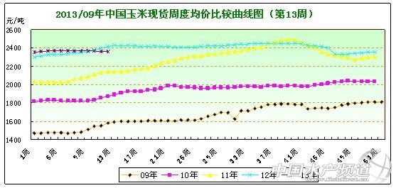 中國(guó)水產(chǎn)頻道報(bào)道,據(jù)上海益農(nóng)訊,2013年第13周(3月25日-3月29日)本周,市場(chǎng)對(duì)玉米的消耗節(jié)奏穩(wěn)定,行情依舊處于弱勢(shì)運(yùn)行狀態(tài)。益農(nóng)監(jiān)測(cè)第13周全國(guó)均價(jià)在2354.33元/噸,較上周下跌0.16%。 ![]() 圖表:2013年第13周中國(guó)局部市場(chǎng)玉米現(xiàn)貨周度均價(jià)比較統(tǒng)計(jì)表(單位:元/噸)