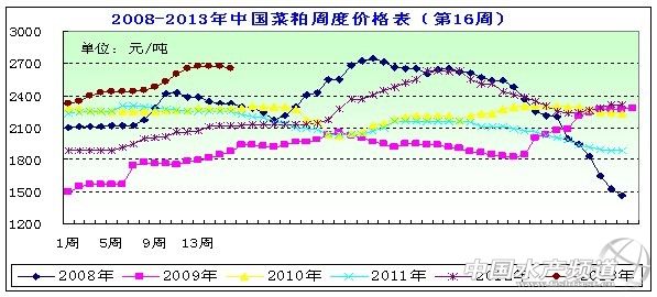 中國水產頻道報道,據上海益農訊, 一、市場概述 本周(2013年/4/12-4/19)。本周初大宗商品受外盤暴跌及中國一季度國內生產總值(GDP)年率增幅回落不及預期影響,拖累國內農產品市場走勢表現分化,其中豆粕相對抗跌,而菜粕期貨價格一枝獨秀,逆勢上揚。國內菜粕現貨價則出現震蕩走勢,預計在國內新菜籽集中上市以前,菜粕下跌可能性有限。本周菜粕均價在2655元/噸左右,周度均價呈穩中略跌趨勢。 圖表:2013年4月第3周(4月12日-4月19日,總第16周)中國主要地區菜粕價格統計(元/噸)