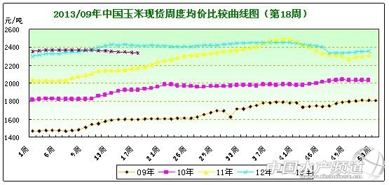 中國水產頻道報道,據上海益農訊,2013年第18周(5月2日-5月3日),玉米市場供應持續增加,而需求短期難有明顯提升,行情維持弱勢。益農監測第17周全國均價在2326.39元/噸,較17周下跌0.25%。 圖表:2013年第18周中國局部市場玉米現貨周度均價比較統計表(單位:元/噸) ![]()