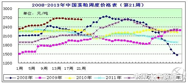 中國(guó)水產(chǎn)頻道報(bào)道,據(jù)上海益農(nóng)訊, 一、市場(chǎng)概述 本周(2013年/5/17-5/24)。本周初受美豆價(jià)格大漲以及目前油脂的銷售狀況不好,企業(yè)在力挺菜粕價(jià)格影響,提振菜粕期貨跳空高開,創(chuàng)出近一個(gè)月新高。23日國(guó)家臨時(shí)存儲(chǔ)菜籽(油)收購(gòu)工作的通知發(fā)布,周五開始部分地區(qū)開始預(yù)售新季國(guó)產(chǎn)菜粕。受新季貨源上市影響,本周國(guó)產(chǎn)菜粕價(jià)格穩(wěn)中略跌,而國(guó)產(chǎn)加籽粕價(jià)格小幅走強(qiáng)。本周菜粕均價(jià)在2633元/噸左右,周度均價(jià)呈穩(wěn)中略跌趨勢(shì)。 圖表:2013年5月第4周(5月17日-5月24日,總第21周)中國(guó)主要地區(qū)菜粕價(jià)格統(tǒng)計(jì)(元/噸)