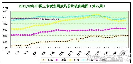中國水產頻道報道,據上海益農訊,2013年第22周(5月27日-5月31日),玉米市場交易相對活躍,終端采購積極性有所升溫,行情小幅波動。益農監測第22周全國均價在2341.78元/噸,較21周基本持平。 ![]() 圖表:2013年第22周中國局部市場玉米現貨周度均價比較統計表(單位:元/噸)
