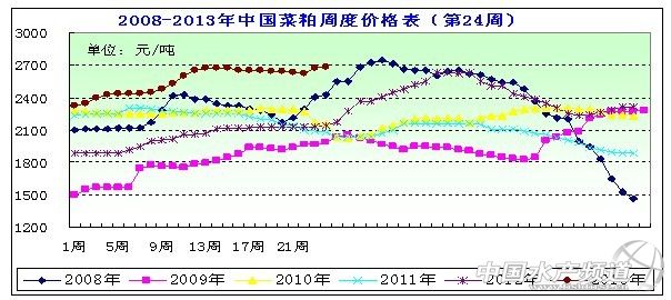 中國水產(chǎn)頻道報道,據(jù)上海益農(nóng)訊, 一、市場概述 本周(2013年/6/7-6/14)。本周初節(jié)前國內(nèi)菜粕期貨呈現(xiàn)沖高回落走勢,主要因短期內(nèi)連續(xù)上漲之后多頭在節(jié)前獲利回吐。節(jié)后菜類品種整體表現(xiàn)較弱,豆粕的弱勢運行,給菜粕期貨帶來下跌氛圍。不過菜粕現(xiàn)貨基本面仍然偏強,現(xiàn)貨供給仍然偏緊,而水產(chǎn)養(yǎng)殖需求增加,且中儲糧的銷售指導價也對價格起到強支撐作用。而端午休假期間,面臨供需報告發(fā)布,市場心態(tài)謹慎,成交清淡。廠商存在力挺菜粕的意愿,預計短期內(nèi)菜粕現(xiàn)貨仍有走強的可能。本周菜粕均價在2684元/噸左右,周度均價呈穩(wěn)中上揚趨勢。 圖表:2013年6月第2周(6月7日-6月14日,總第24周)中國主要地區(qū)菜粕價格統(tǒng)計(元/噸)