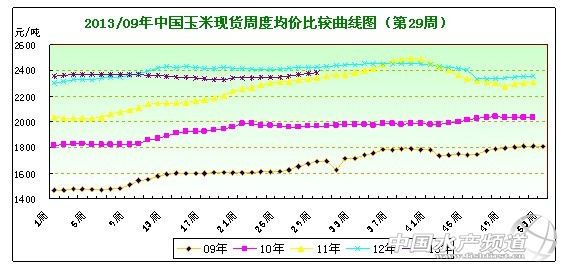 中國水產頻道報道,據上海益農訊,2013年第29周(7月15日-7月19日),玉米市場購銷相對平淡,產區余糧不足購銷陸續結束,下游需求依然旺盛支撐行情走勢。益農監測第29周全國均價在2384.33元/噸,較28周上漲0.35%。 ![]()